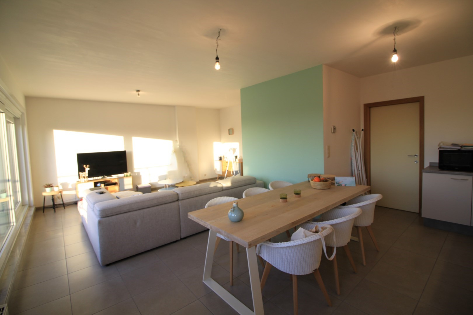 Het appartement omvat een inkom, leefruimte met aansluitend een groot zuidgericht terras (32 m²) en mooie vergezichten, open ingerichte keuken, berging, 2 slaapkamers, badkamer, toilet en garage.