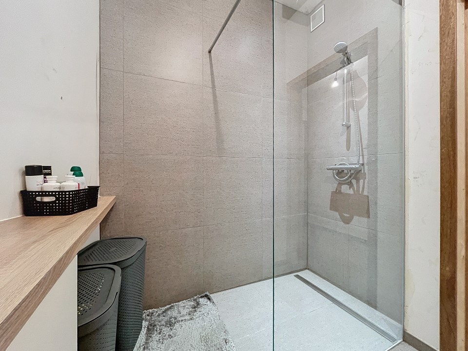 Het appartement beschikt verder over 2 slaapkamers waarvan 1 slaapkamer met ingemaakte kasten. De 2de slaapkamer geeft toegang tot het 2de terras. De badkamer biedt u een lavabomeubel en een inloopdouche. In de hall vindt u verder nog het gastentoilet en een bergruimte.