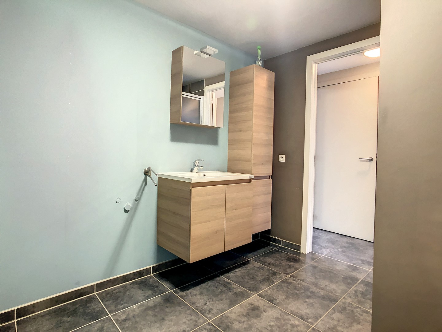 Bij het betreden van het appartement komen we in de inkomhal met gastentoilet. Aansluitend vinden we de ruime woonkamer met open keuken en terras. Aan de achterkant van het appartement vinden we een ruime slaapkamer, berging (of kleine slaapkamer) en badkamer voorzien van douche en lavabo. 50,00 EUR syndic/maand.