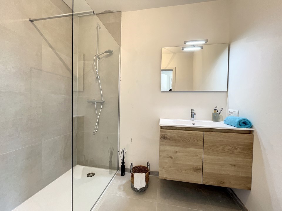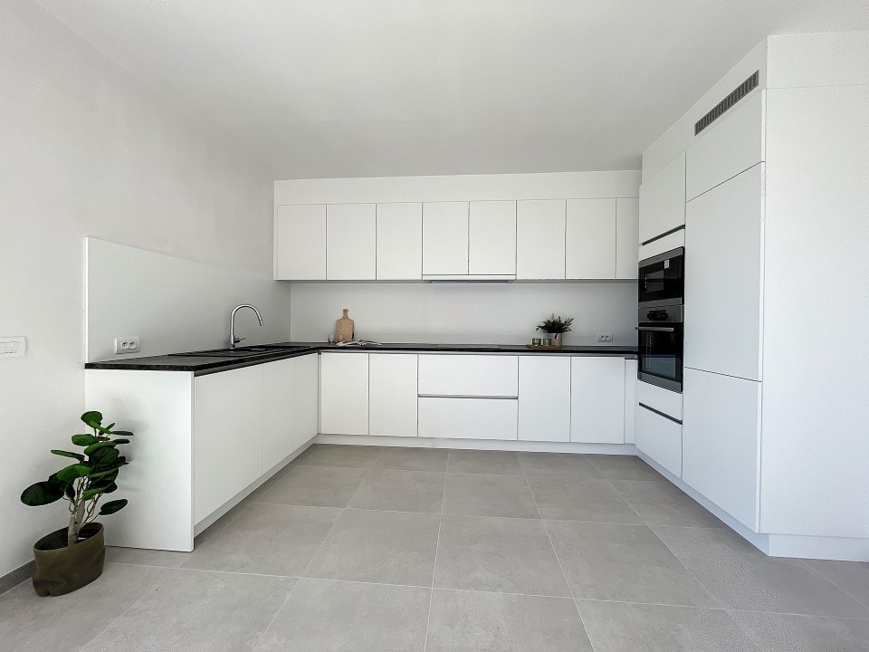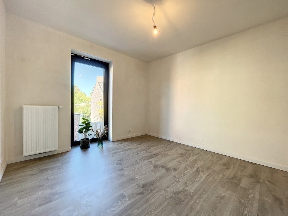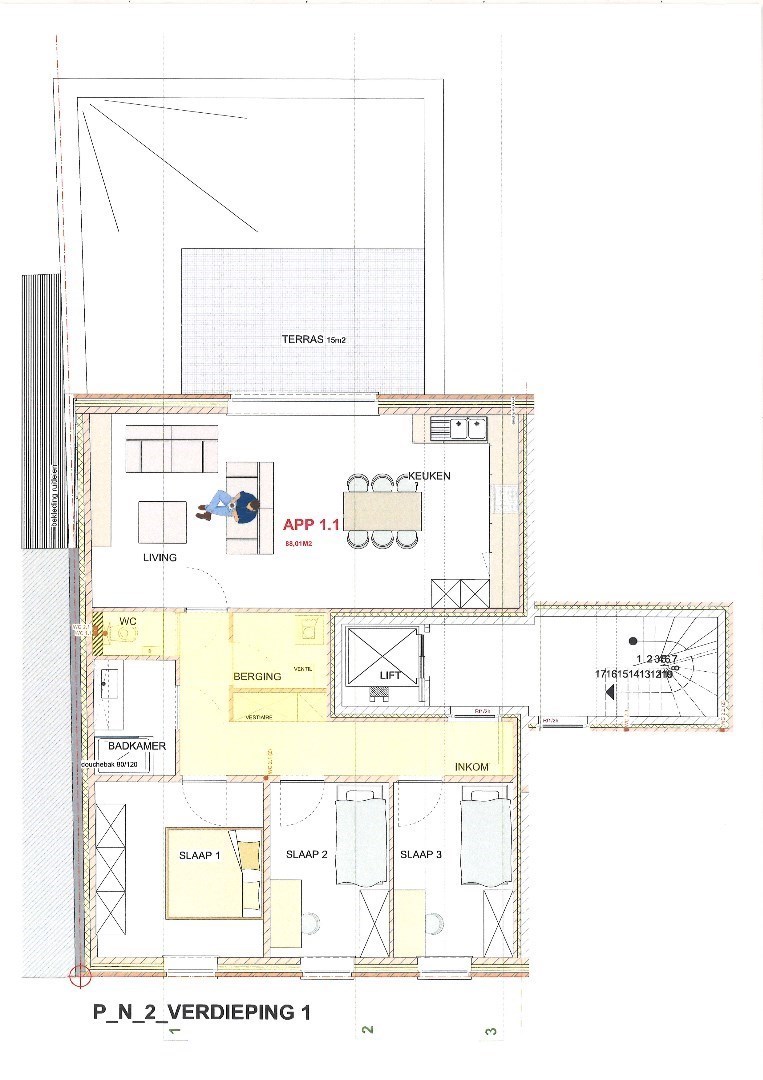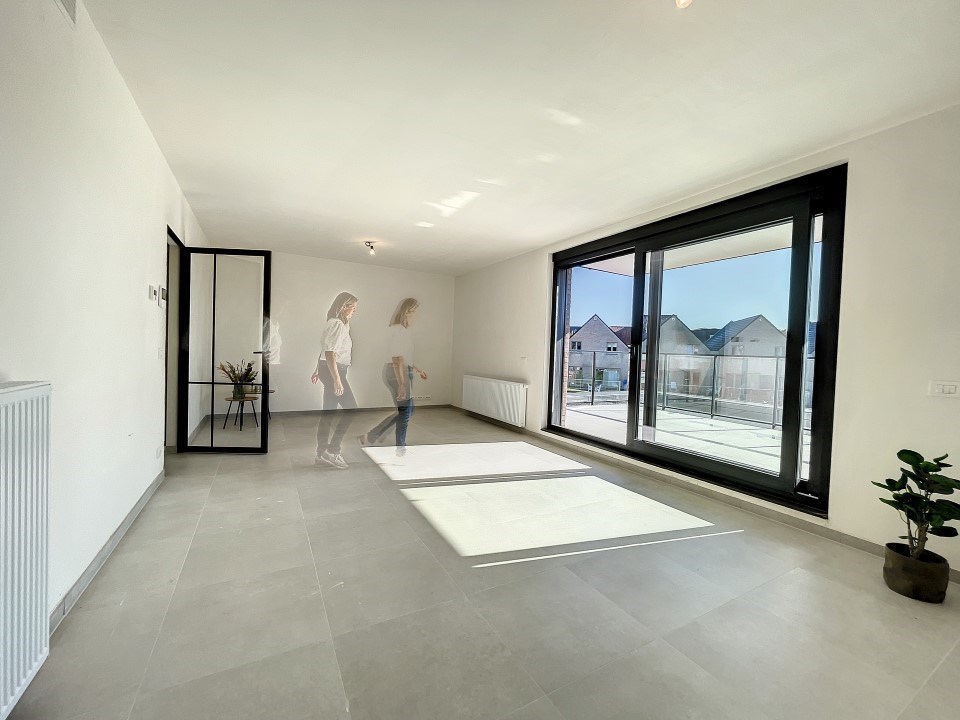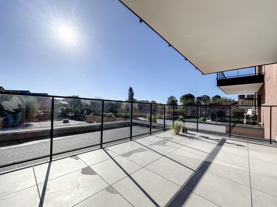 Het appartement omvat inkom, lichtrijke leefruimte met schuifraam dat uitgeeft op het terras (15m²), open keuken (ingericht met toestellen), bergruimte, toilet, badkamer met lavabomeubel en douche, 3 slaapkamers.