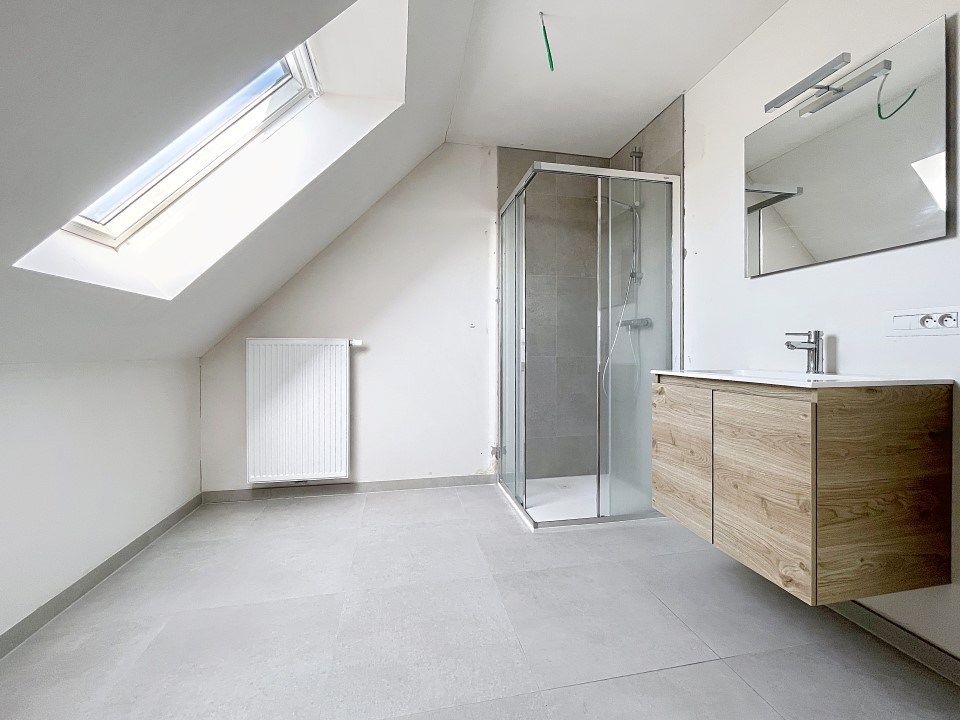 Het appartement geniet volgende indeling : inkom, leefruimte met toegang (via schuifraam) tot het zuid-west gericht terras, toilet, badkamer 1 met lavabomeubel en douche én 1 slaapkamer. Via de trap kan u zich begeven naar de 2 slaapkamers, toilet en badkamer 2 voorzien van een lavabomeubel en douche.