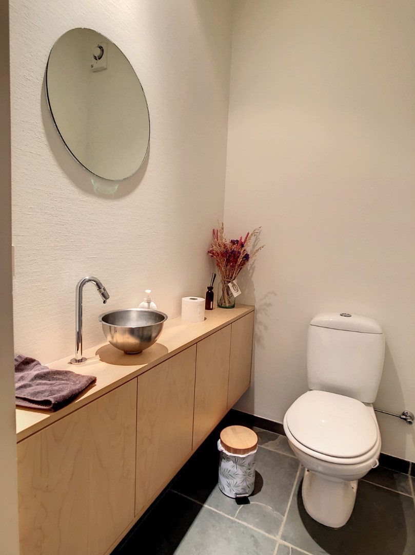 Het pand geniet volgende indeling op het gelijkvloers: inkomhal met toilet, 2 ruime kamers, kitchenette, kelder, terras en aangelegde tuin. Op het verdiep is er 1 grote en lichtrijke open ruimte en nog één aparte kamer. Tevens werd een douche-ruimte geïnstalleerd.
