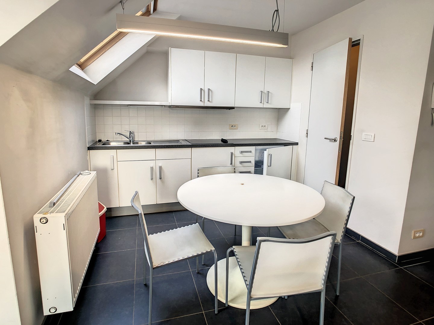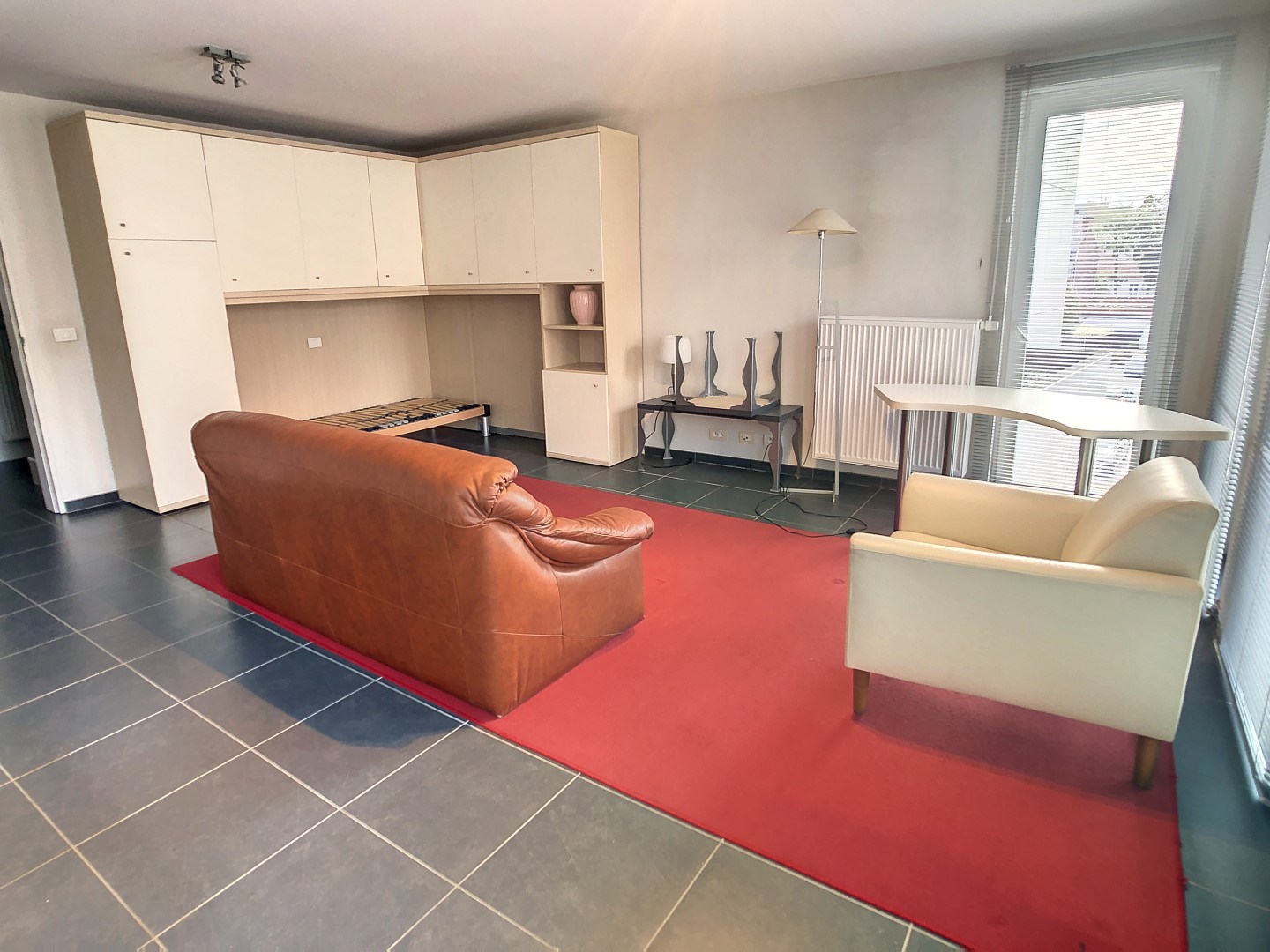 We vinden deze studio terug in het centrum van Roeselare, op wandelafstand van de Grote Markt, openbaar vervoer en diverse handelszaken. Deze lichtrijke studio omvat een leefruimte met slaapvertrek, keuken, berging en badkamer.