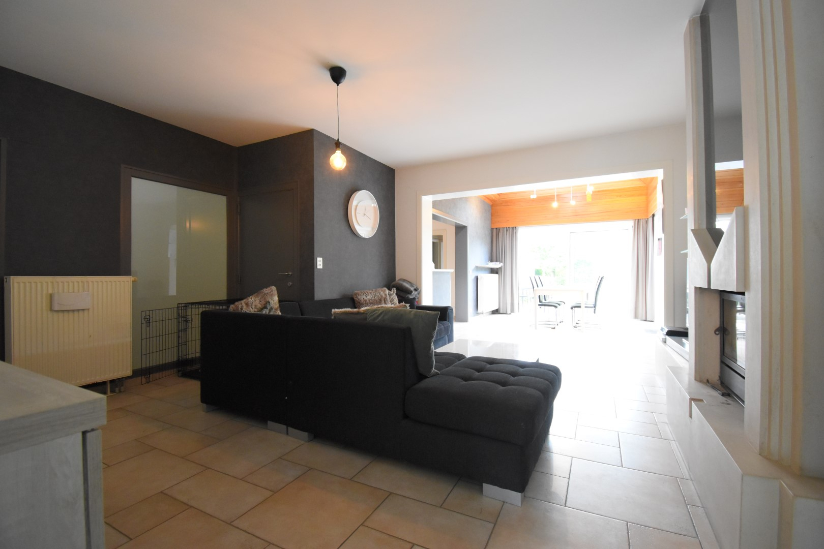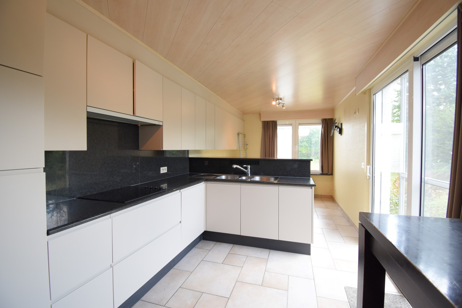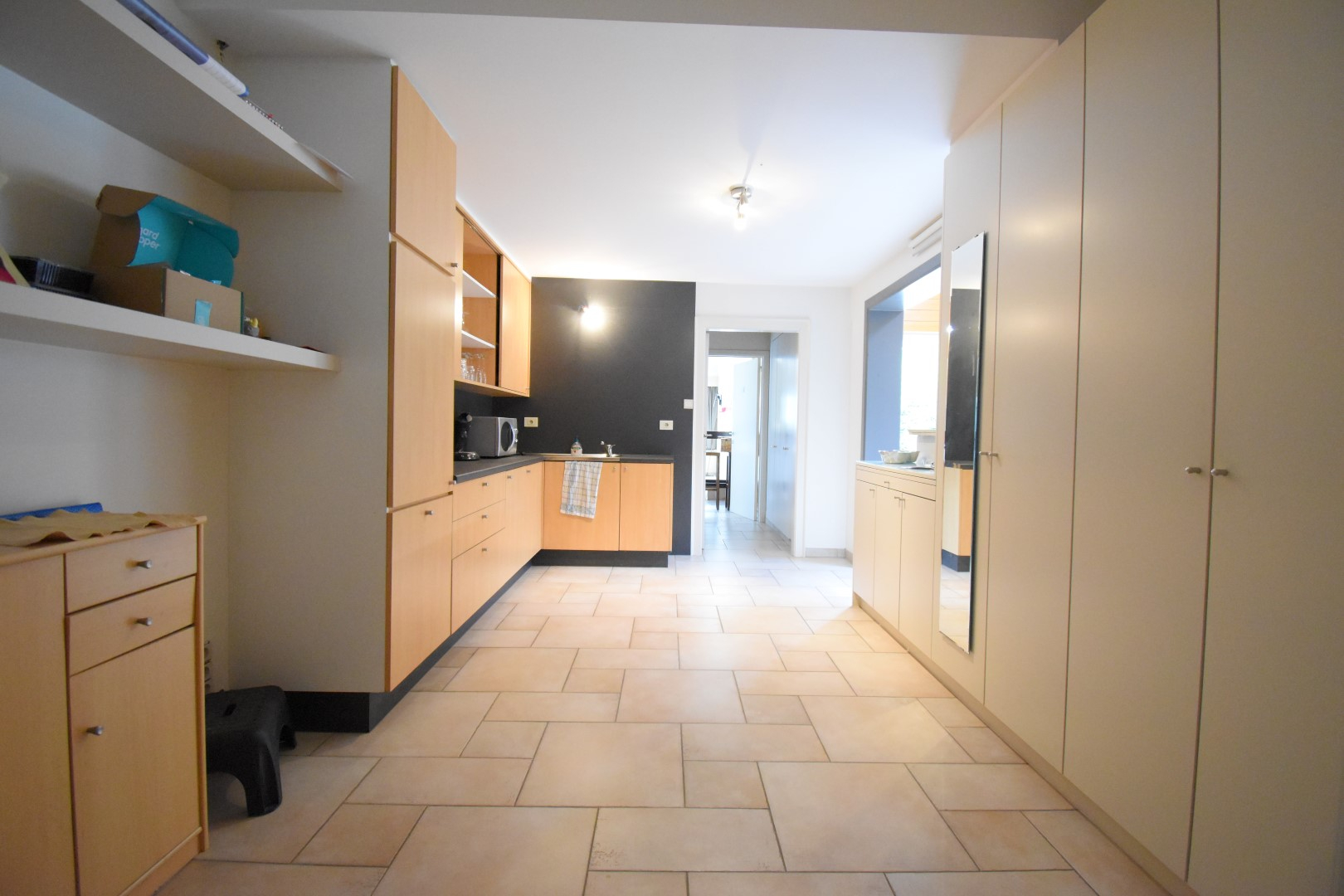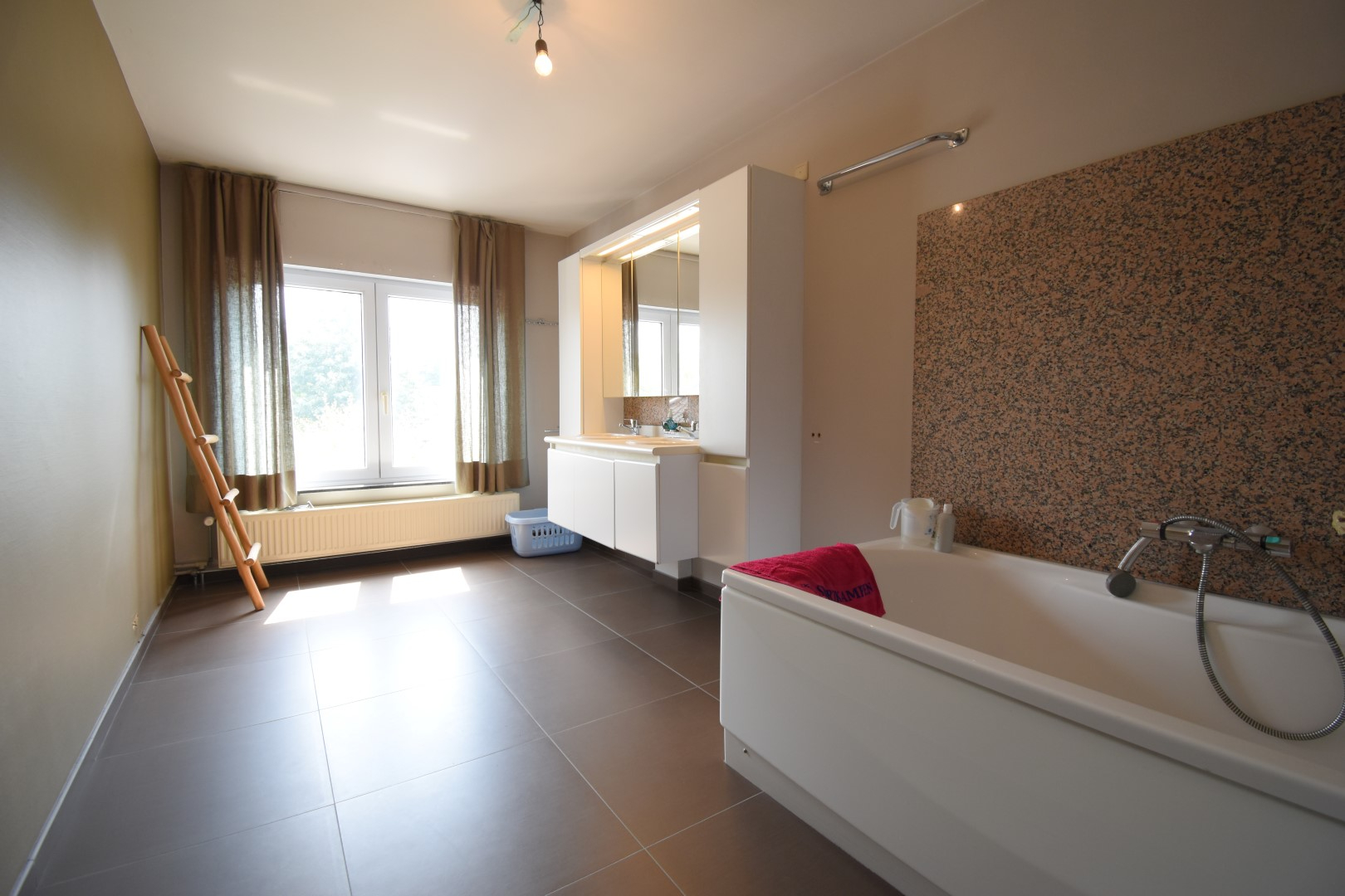 De woning beschikt over een ruime woon- en eetkamer met zicht op de tuin en open keuken voorzien van frigo, diepvries, vaatwas, elektrisch fornuis en oven. Achterliggend vinden we een douchekamer met lavabo en toilet en een tweede keuken met frigo en gootsteen. Het verdiep beschikt over 3 ruime slaapkamers waarvan 1 met dressing. Verder vinden we er de badkamer die voorzien is van ligbad met dubbel lavabomeubel.