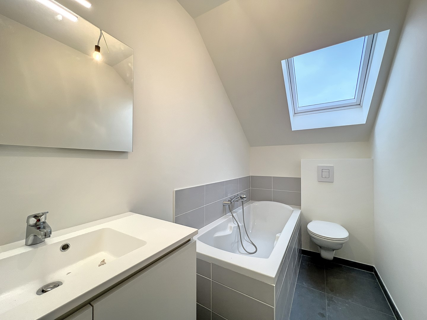Deze nieuwbouwwoning omvat een inkom, toilet, zonnige leefruimte met open keuken (voorzien van toestellen), bergruimte, 3 slaapkamers en een badkamer (ligbad en lavabomeubel).