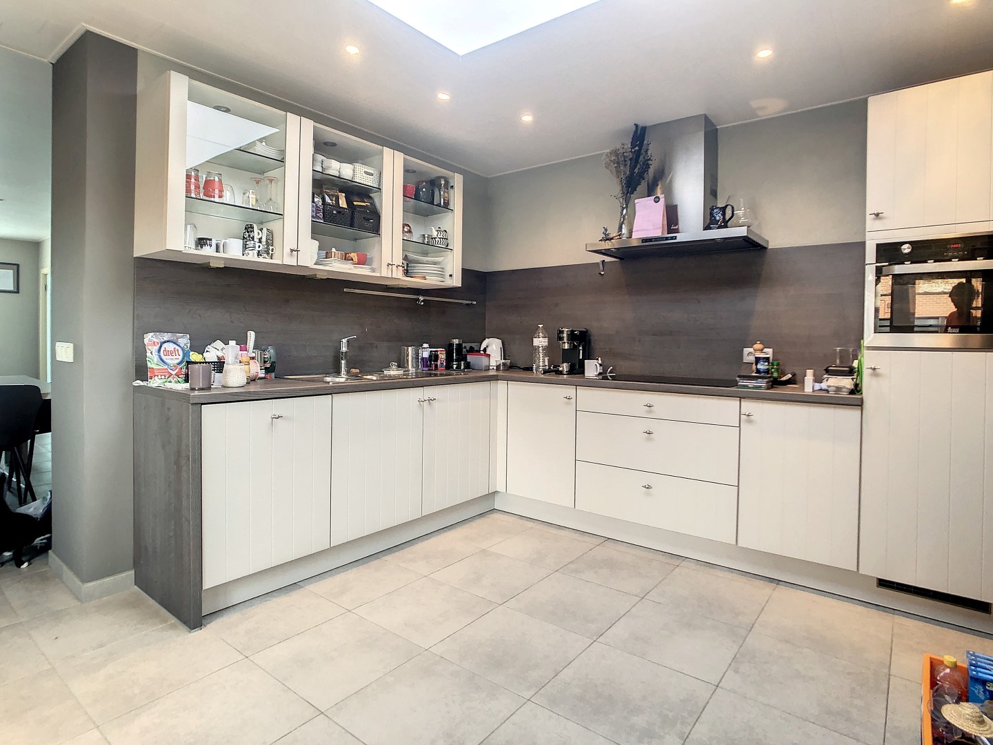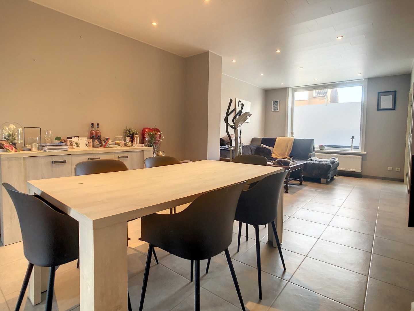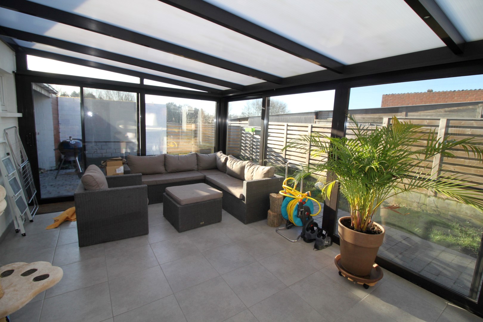 De indeling is als volgt: inkom, lichtrijke leefruimte, open ingerichte keuken (o.a. vaatwas, Amerikaanse frigo,...), veranda, berging, badkamer (inloopdouche, dubbele lavabo en toilet),