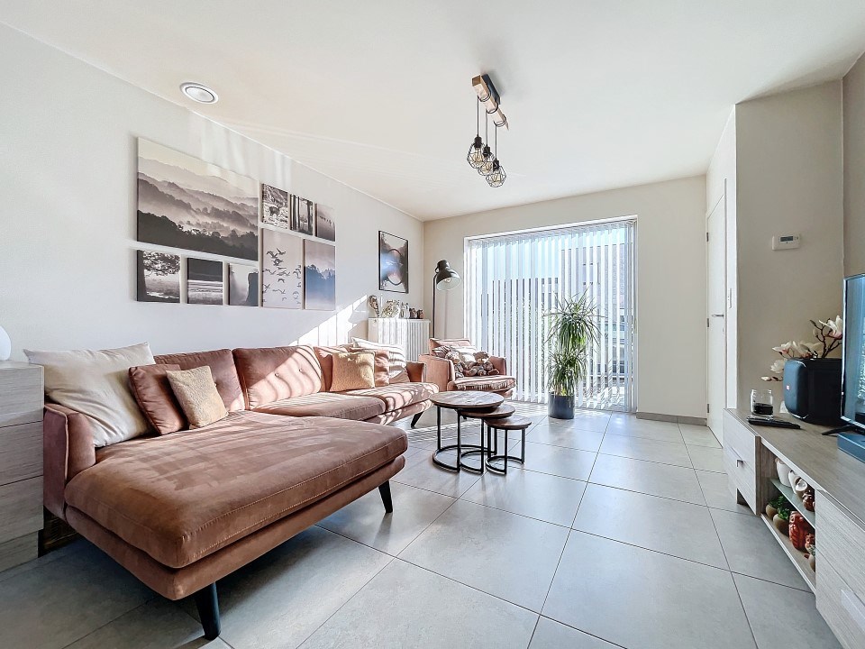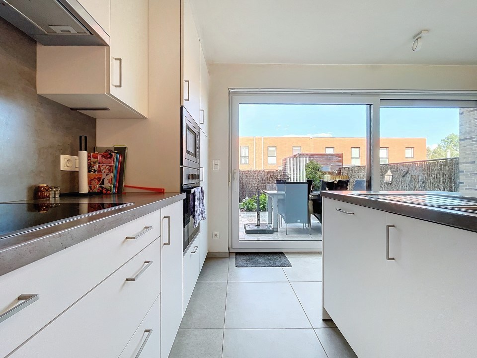 Via de inkom bereikt u de zonnige leefruimte en half-open keuken (voorzien van alle toestellen), bergruimte, toilet, tuin met groot terras, 3 slaapkamers, 2de toilet, extra berging en een badkamer met lavabomeubel, ligbad én douche.