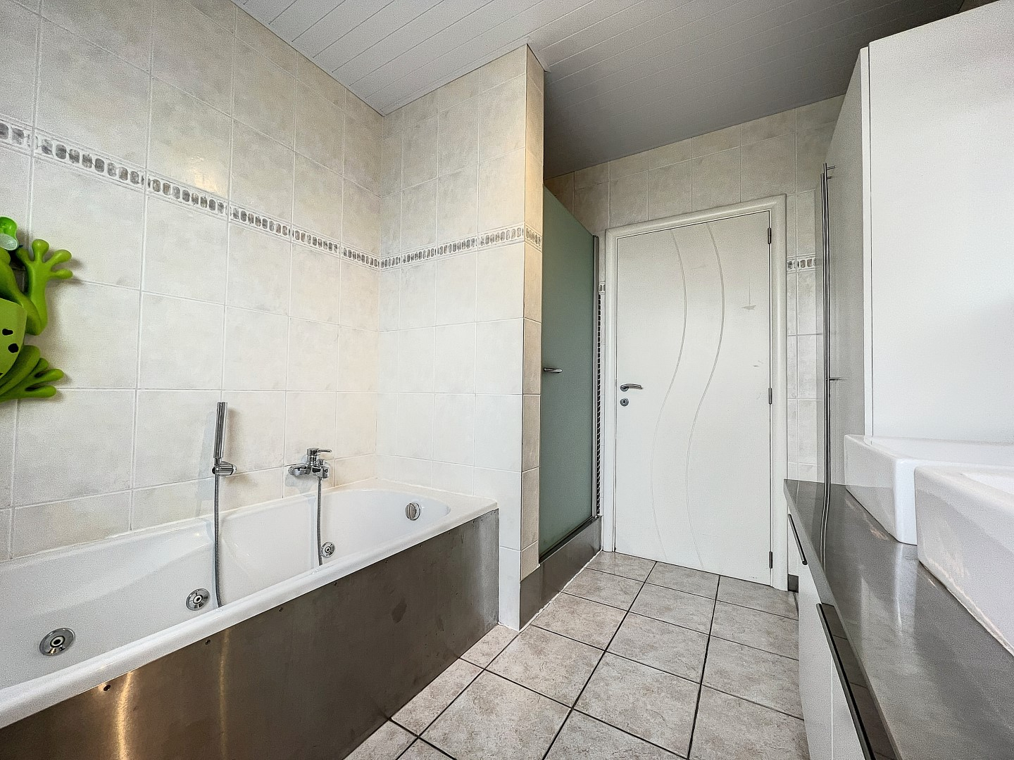 Verder op het gelijkvloers vinden we een ruime bureauruimte die ook dienst kan doen als gelijkvloerse slaapkamer, de badkamer voorzien van ligbad én douche, aparte wasruimte en inpandige garage met automatische poort.