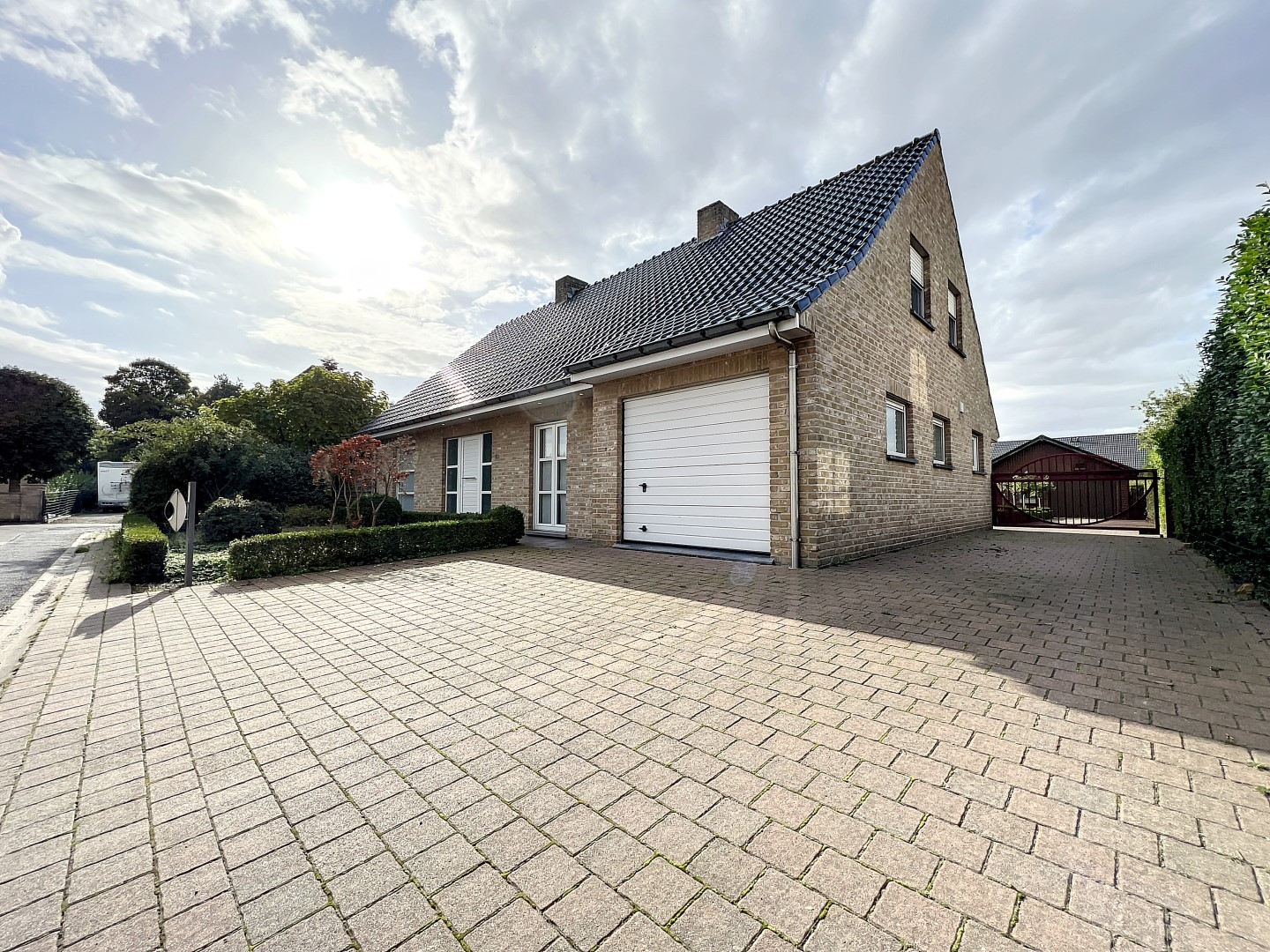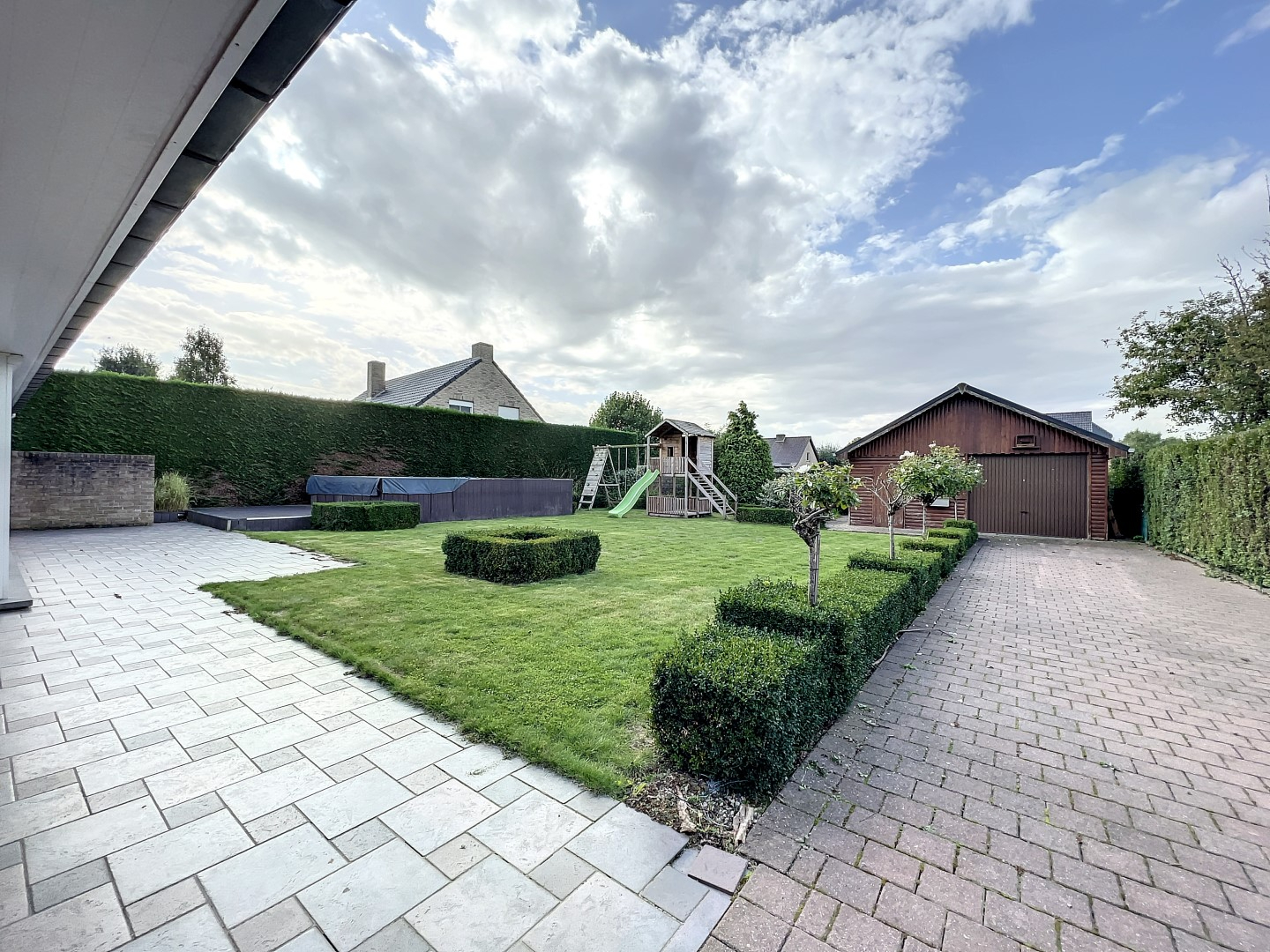 De zuidgerichte tuin met terras beschikt tevens over een tuinhuis en een 2de garage.