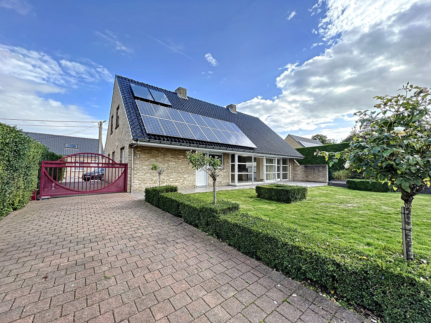 We vinden deze woning terug in een doodlopende straat nabij het centrum van Madonna, Langemark.
