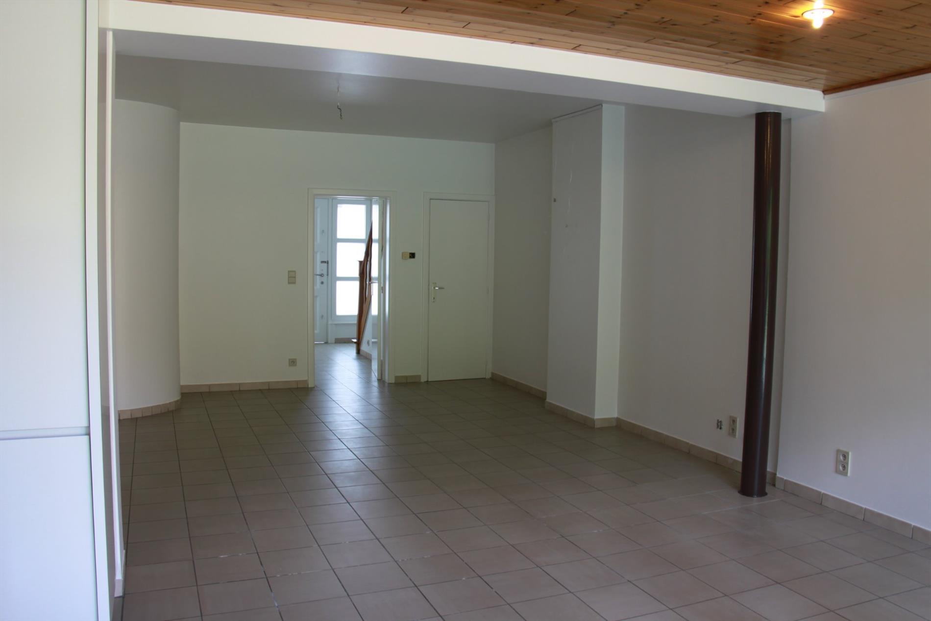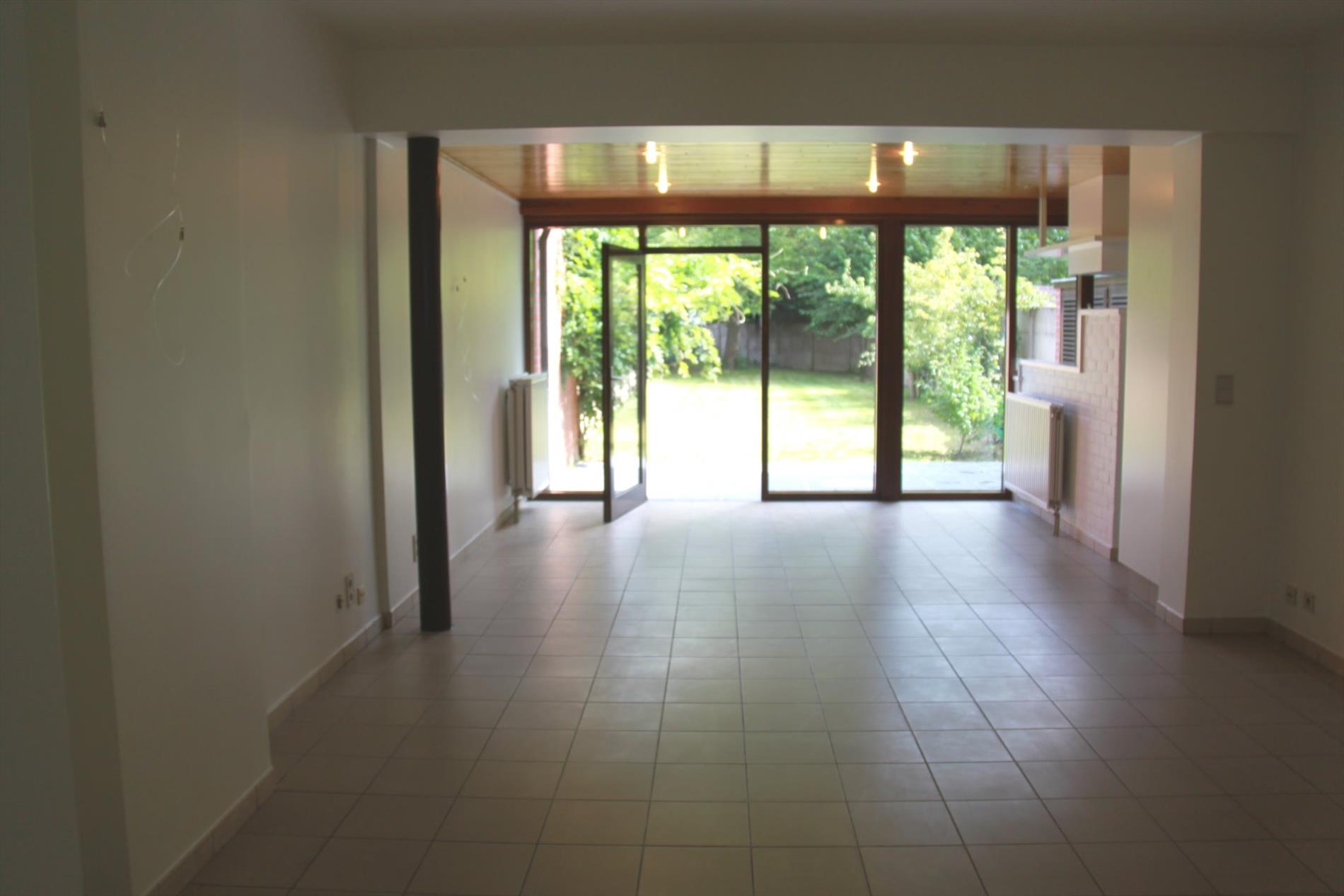 De woning omvat op het gelijkvloers een inpandige garage, een ruime hall met gastentoilet en een grote leefruimte met open keuken uitgevend op een volledig omsloten tuin. Een droge en zeer nuttige kelder voor proviand is aanwezig.