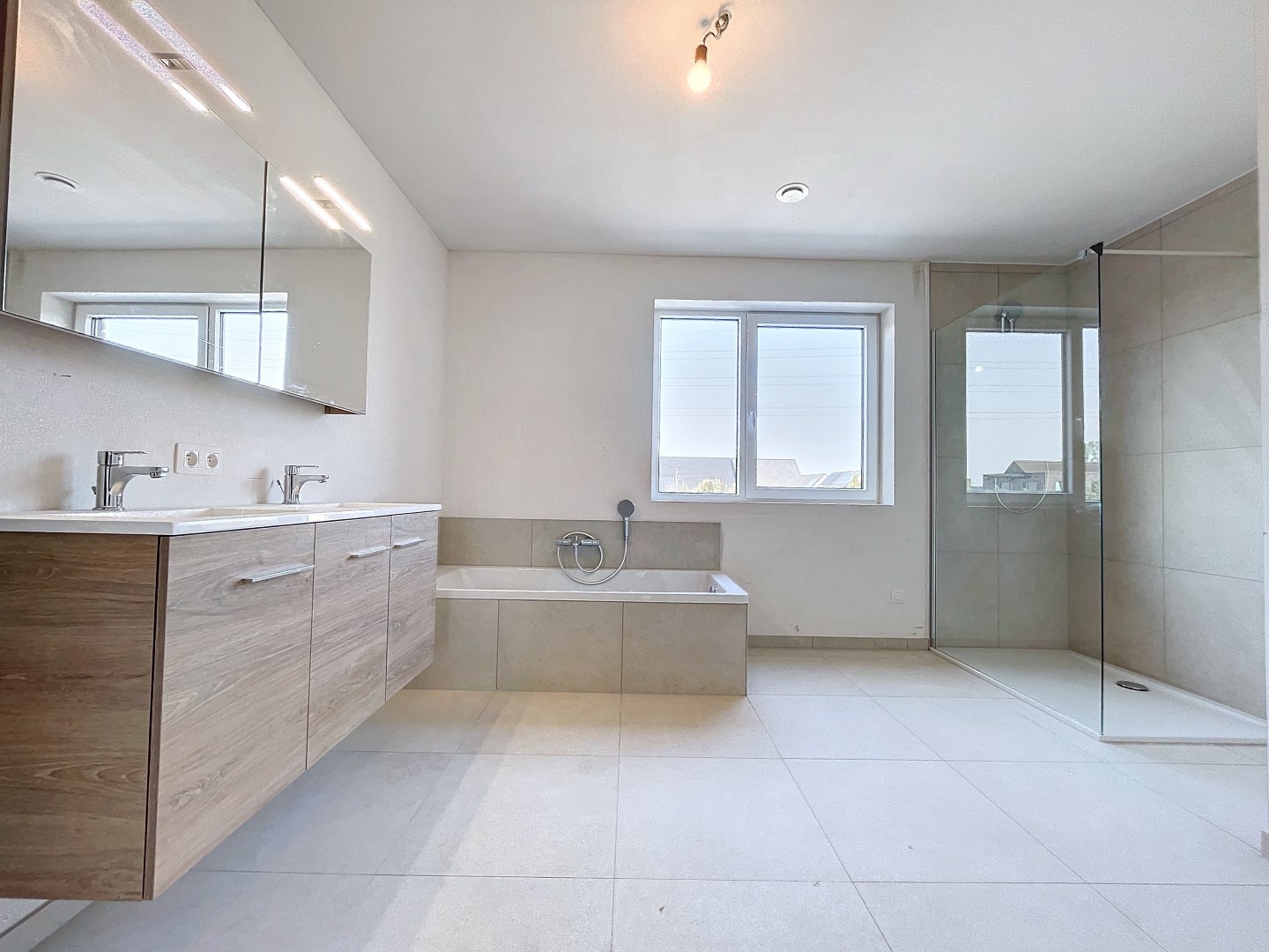 Op het verdiep vinden we de 3 slaapkamers, waarvan 1 met dressing, toilet en een ruime badkamer voorzien van dubbele lavabo, douche én ligbad.