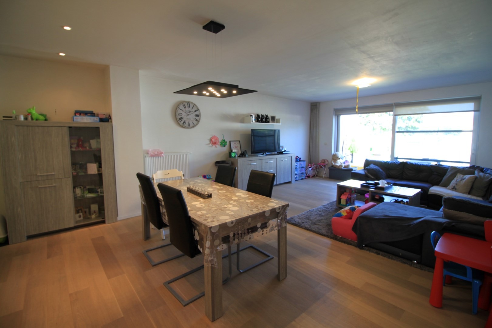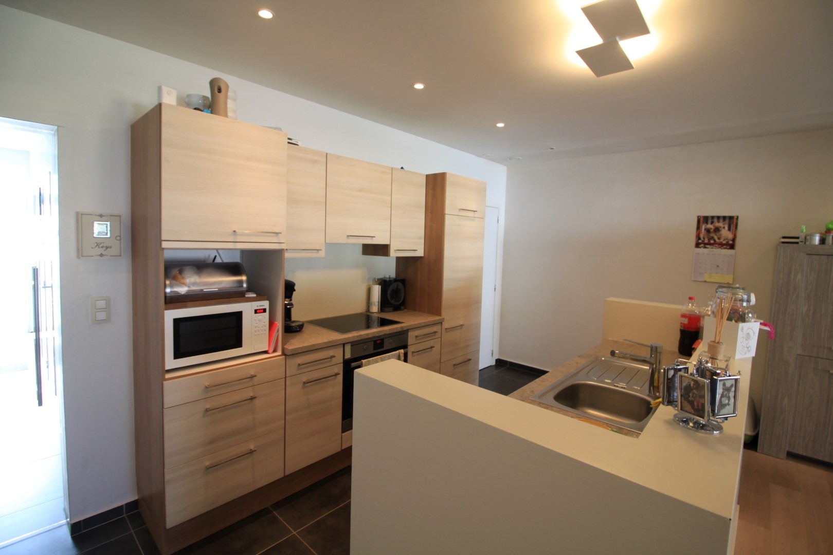 Deze volledig gerenoveerde woning is heel rustig gelegen en beschikt op het gelijkvloers over een inkom, toilet, bureau, bergruimte, leefruimte met veel lichtinval die uitgeeft op het terras en de tuin én een open ingerichte keuken.