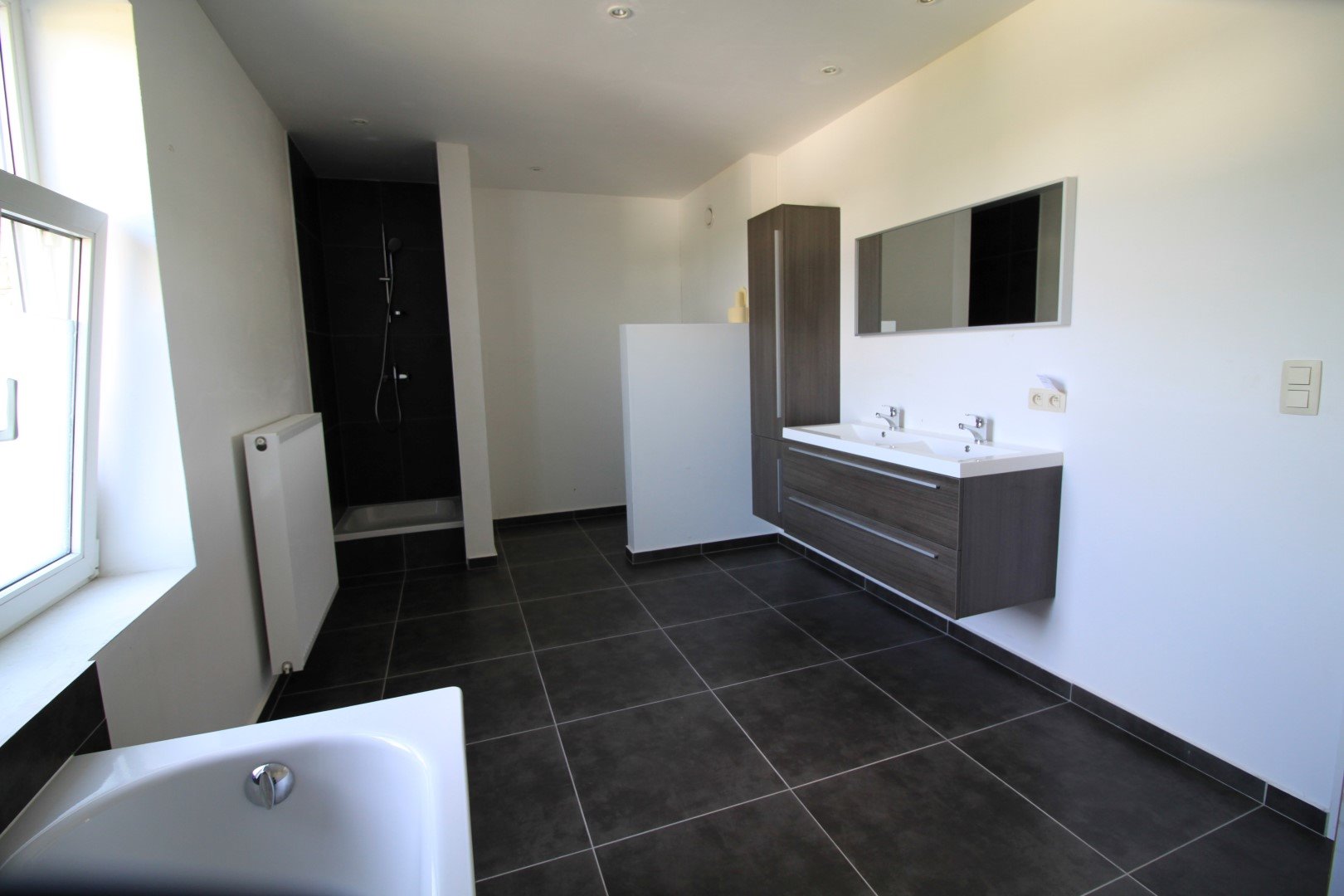 Op de verdiepingen voorziet de woning nog 3 grote slaapkamers en een ruime badkamer met ligbad, douche, dubbele lavabo en 2de toilet. Achter de woning ligt de private garage.