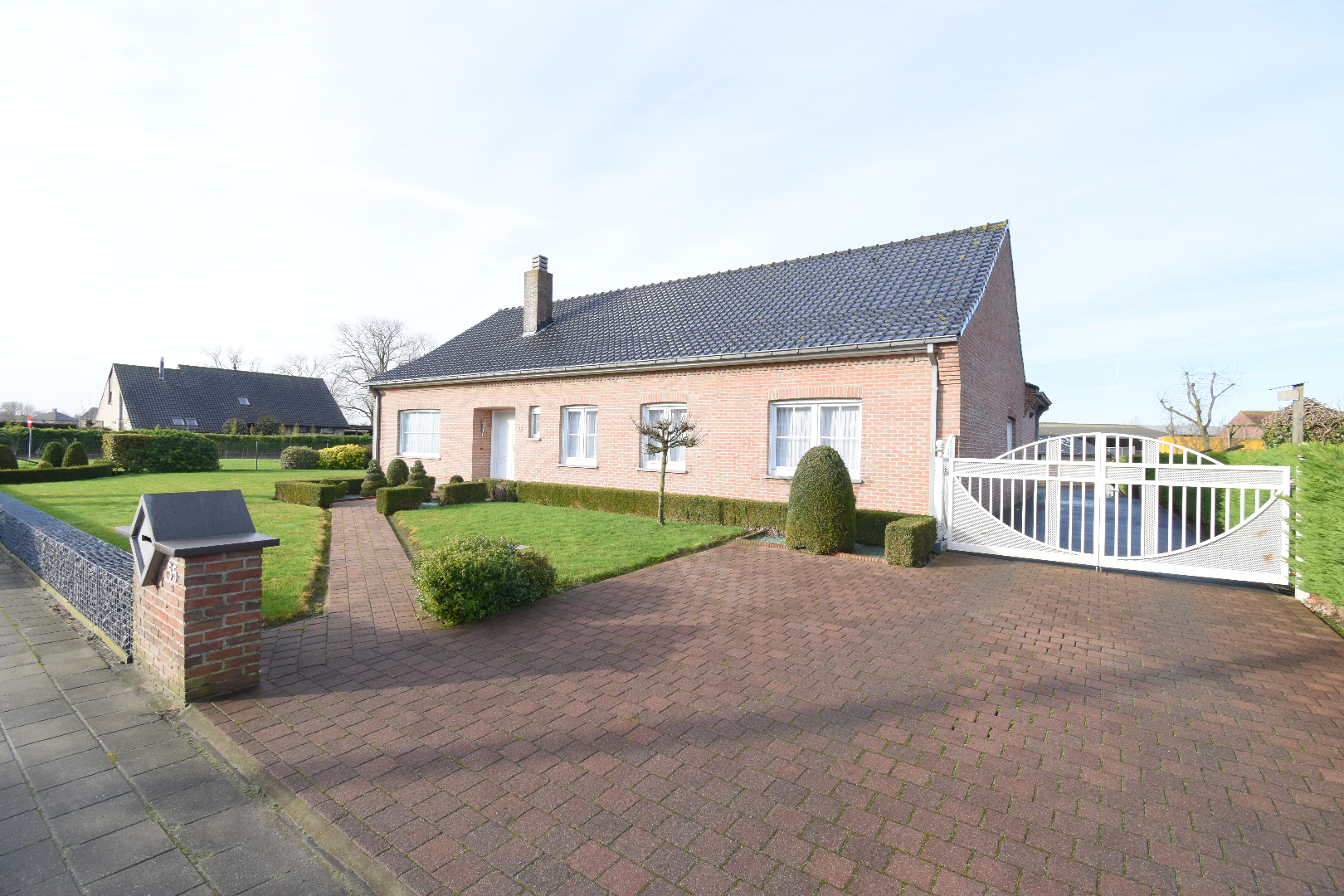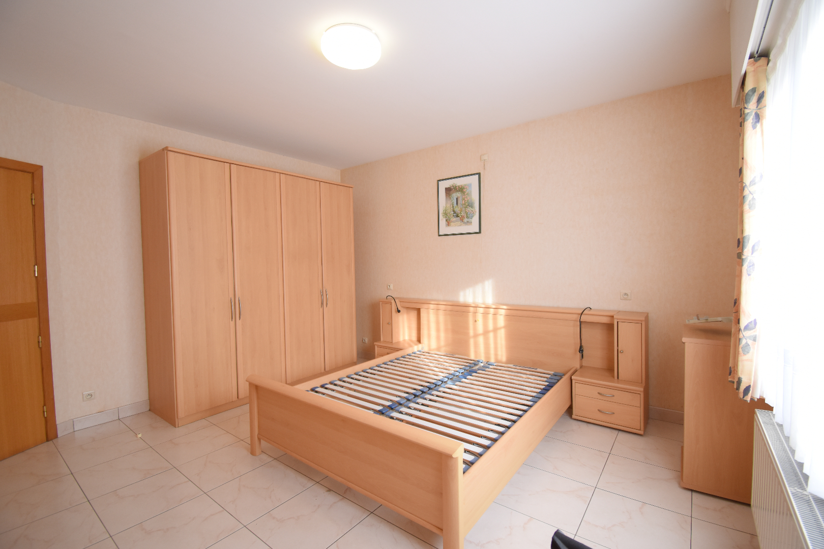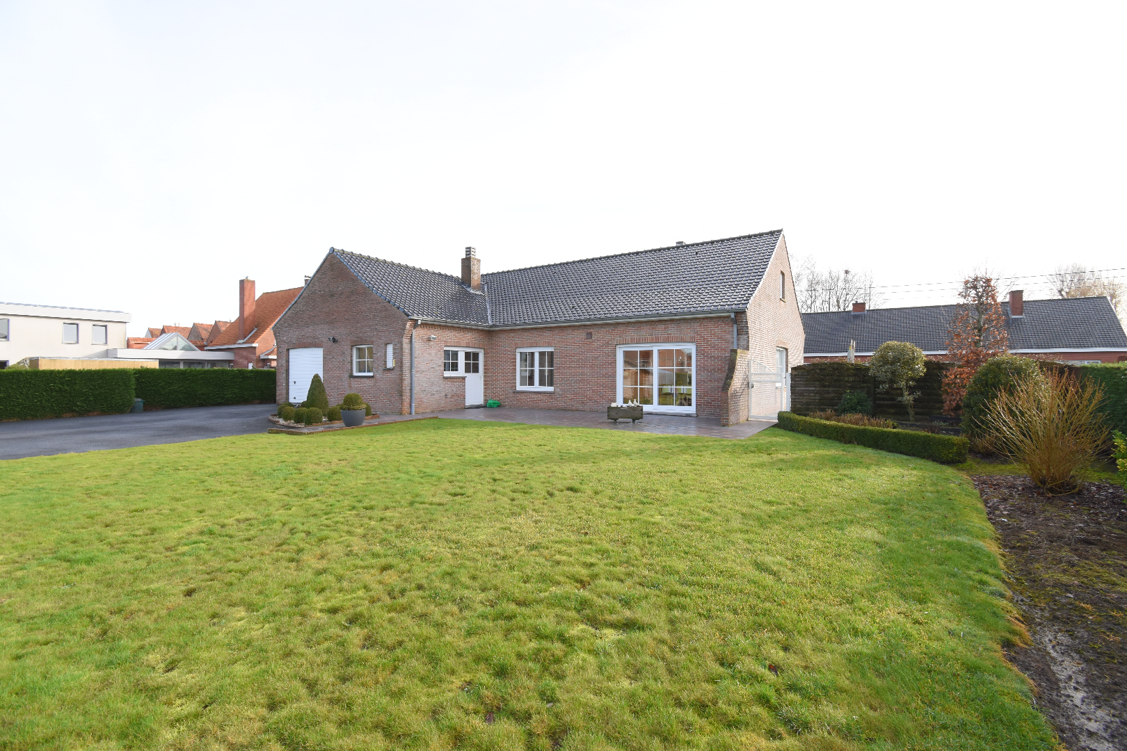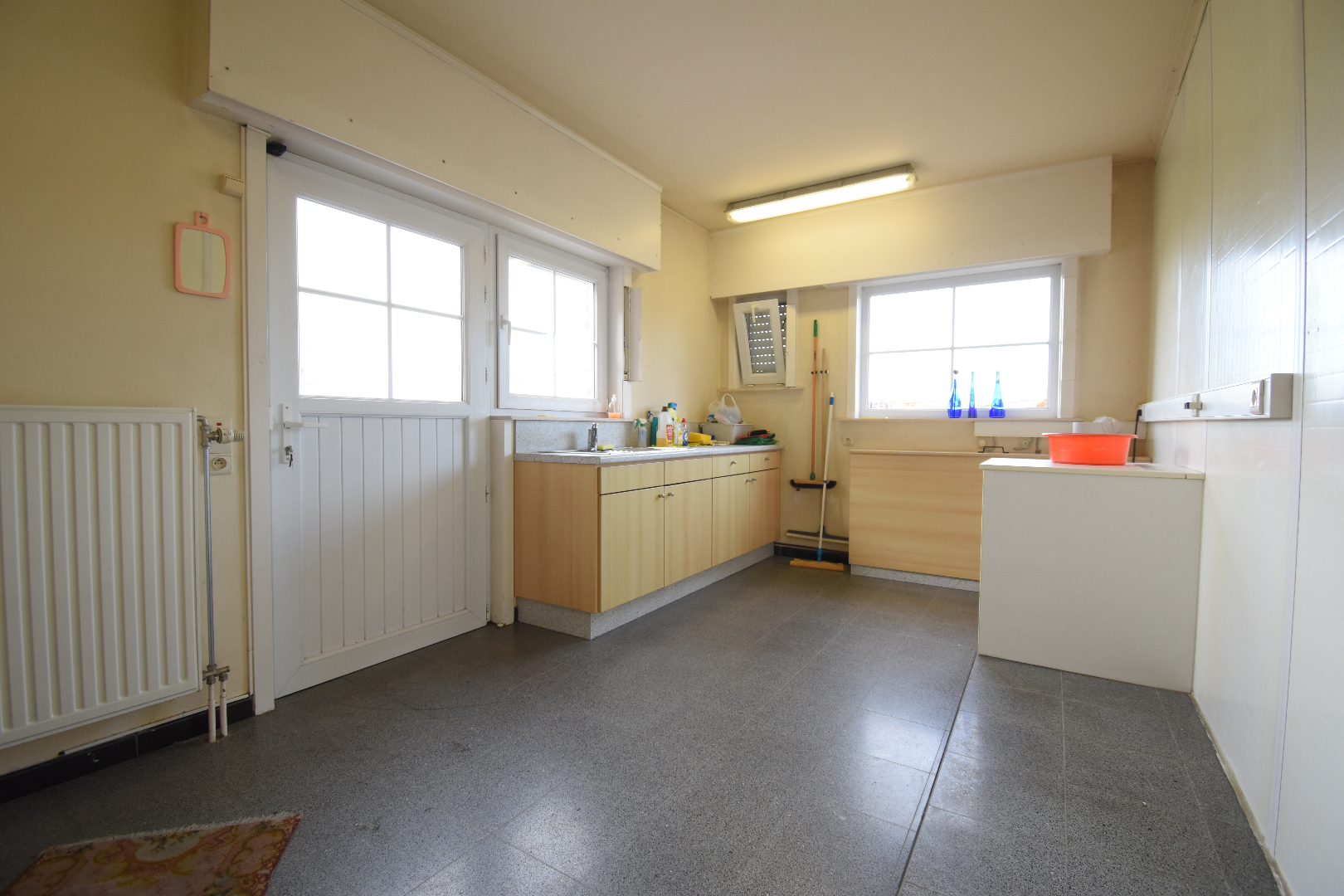 Bij het betreden van de woning komen we binnen in de inkomhal met gastentoilet. Aansluitend vinden we de lichtrijke woonkamer die uitkijkt op de tuin. De keuken, voorzien van frigo, oven, vaatwasser, elektrisch fornuis, heeft net zoals de woonkamer zicht op de tuin. Aansluitend bij de keuken is er een voorraadkamer. Verder op het gelijkvloers bevinden zich 3 slaapkamers, ingerichte badkamer (douche-bad-lavabo-toilet). Achteraan de woning bevinden zich nog de ruime bijkeuken en garage met elektrische poort.
