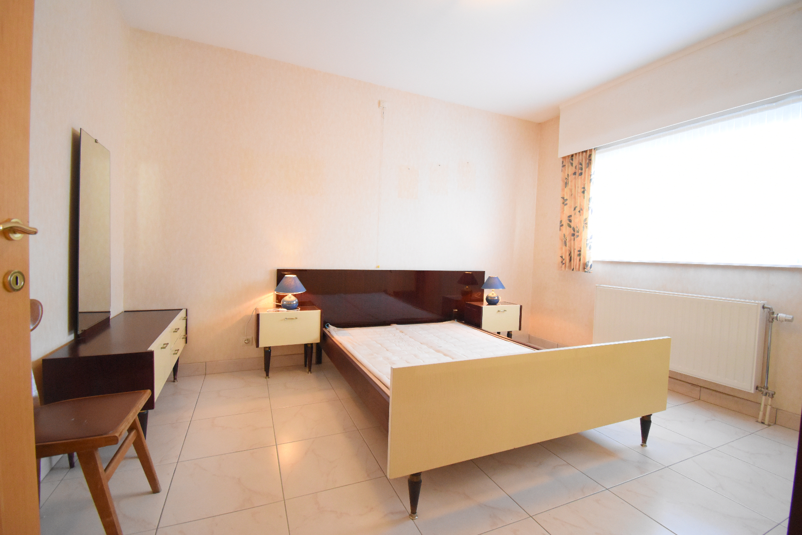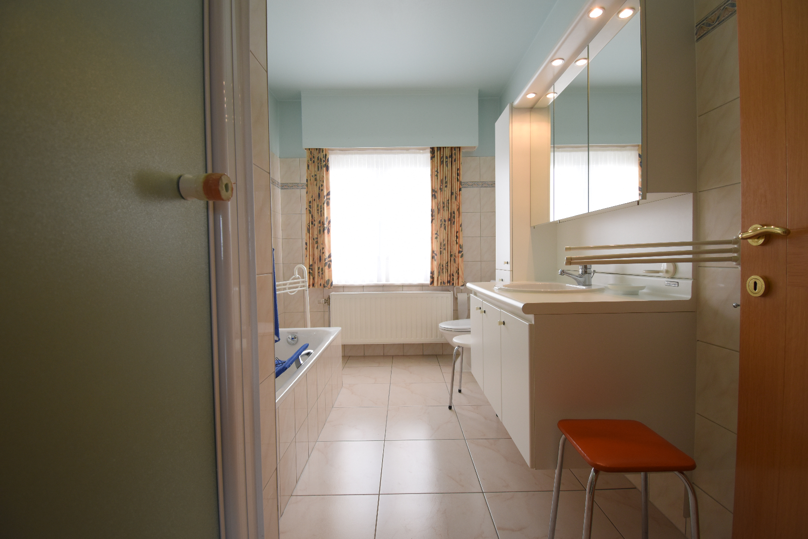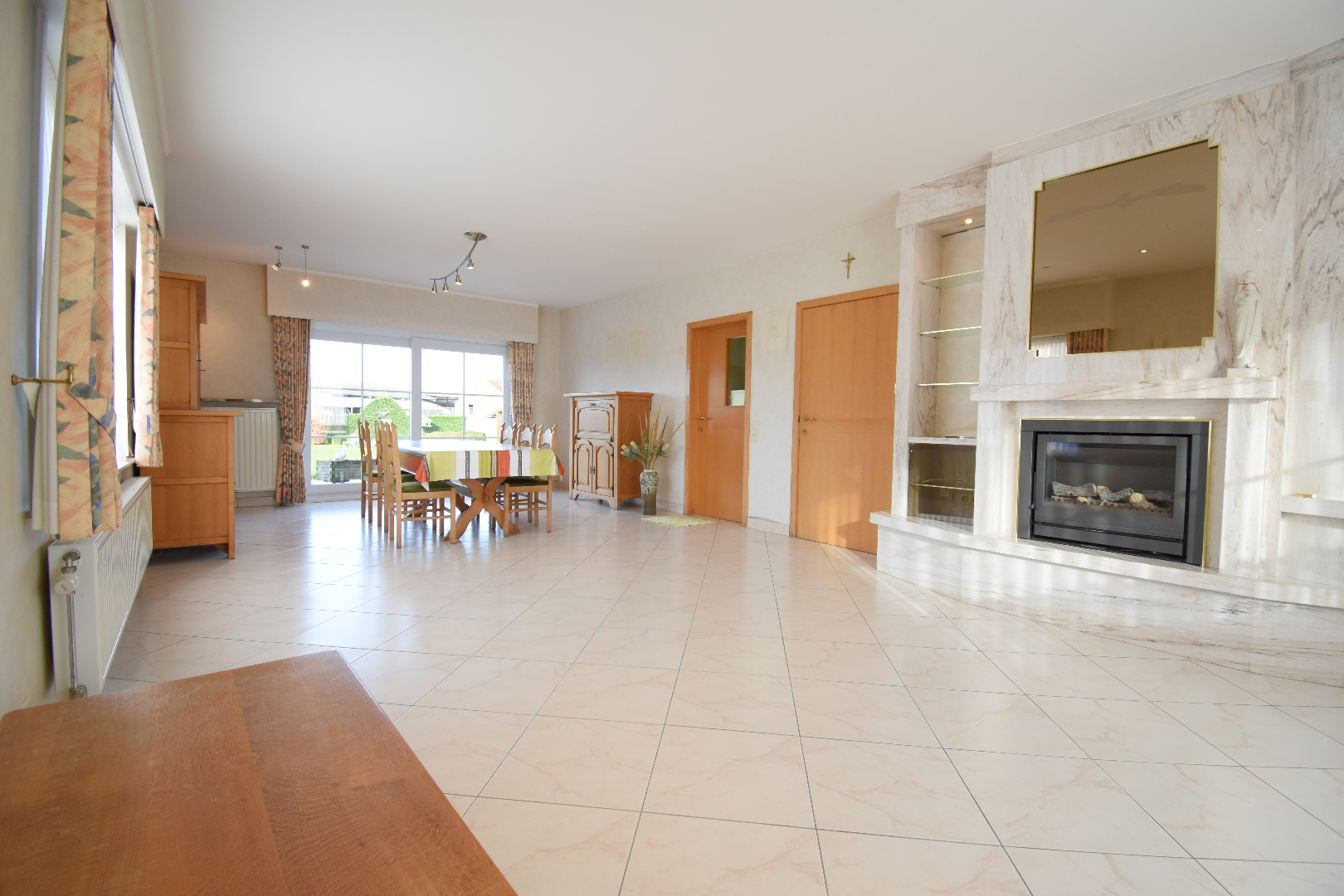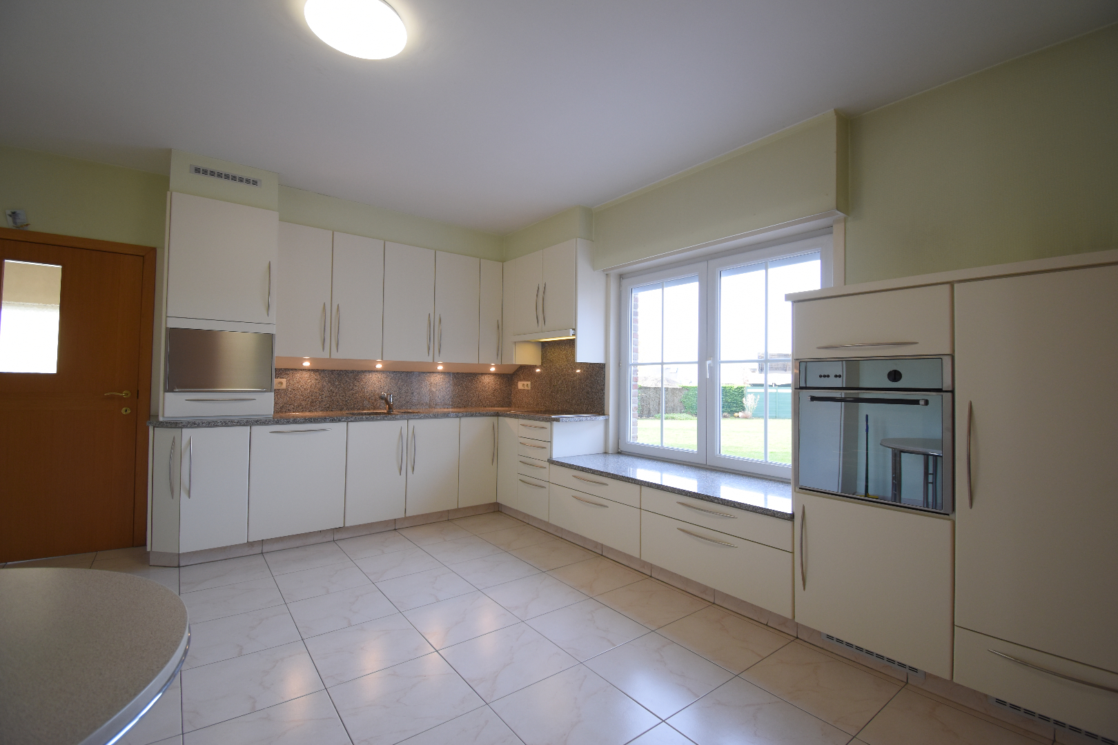 Bij het betreden van de woning komen we binnen in de inkomhal met gastentoilet. Aansluitend vinden we de lichtrijke woonkamer die uitkijkt op de tuin. De keuken, voorzien van frigo, oven, vaatwasser, elektrisch fornuis, heeft net zoals de woonkamer zicht op de tuin. Aansluitend bij de keuken is er een voorraadkamer. Verder op het gelijkvloers bevinden zich 3 slaapkamers, ingerichte badkamer (douche-bad-lavabo-toilet). Achteraan de woning bevinden zich nog de ruime bijkeuken en garage met elektrische poort.