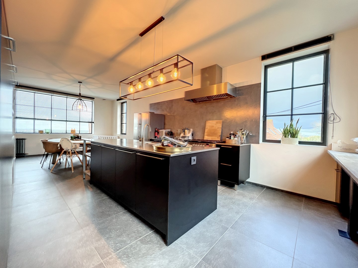 Verdiep: ruime woonkamer met open en ingerichte keuken, berging, toilet