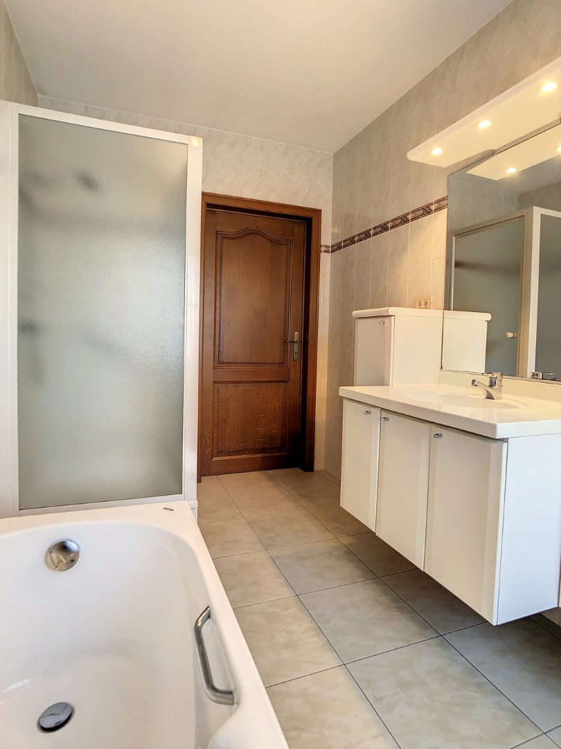 De woning omvat inkomhall, lichtrijke leefruimte met voorziening van een houtcassette, volledig ingerichte leefkeuken, wasplaats, 1 slaapkamer op het gelijkvloers (of bureau), badkamer (lavabo, bad en douche), toilet en garage. Op het verdiep bevinden zich 2 ruime slaapkamers , toilet en een zolderruimte.