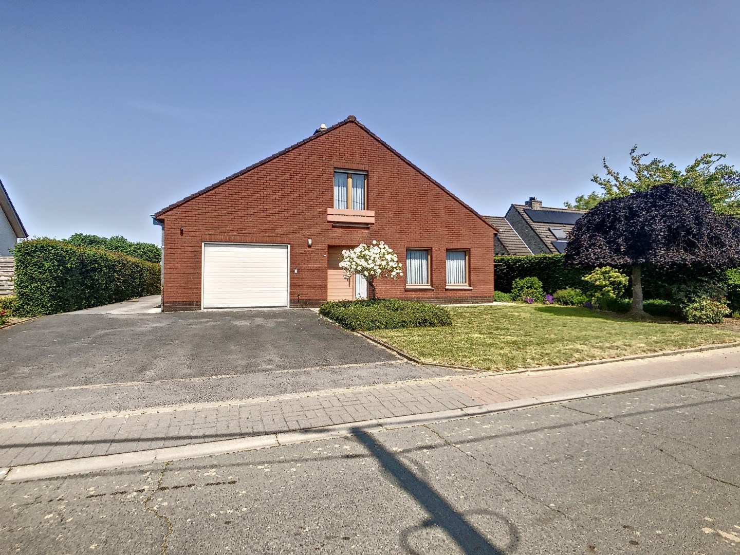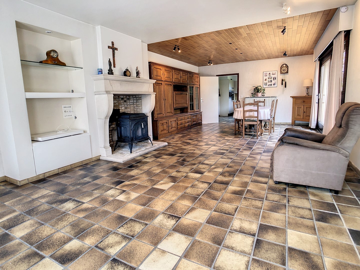 inkom - toilet - ruime en lichtrijke leefruimte voorzien van een houtkachel - woonkeuken (ingericht met toestellen) - wasplaats met berging - kelder - 2 slaapkamers - badkamer (douche, bad en lavabo met meubel) - inpandige garage