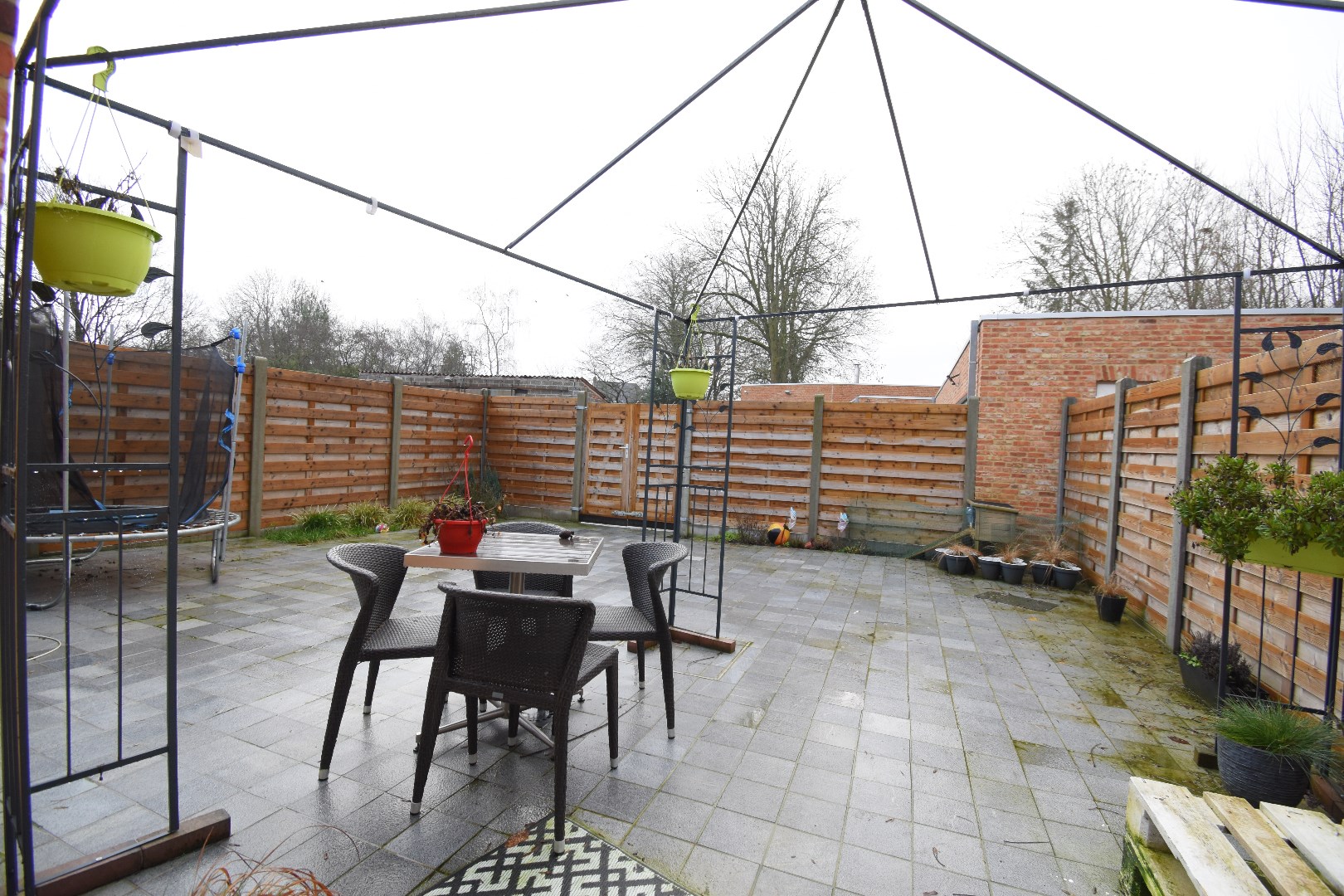 Bij de woning hoort een zongericht terras met uitweg achteraan die toegang verleent tot de bijhorende, dubbele garage.