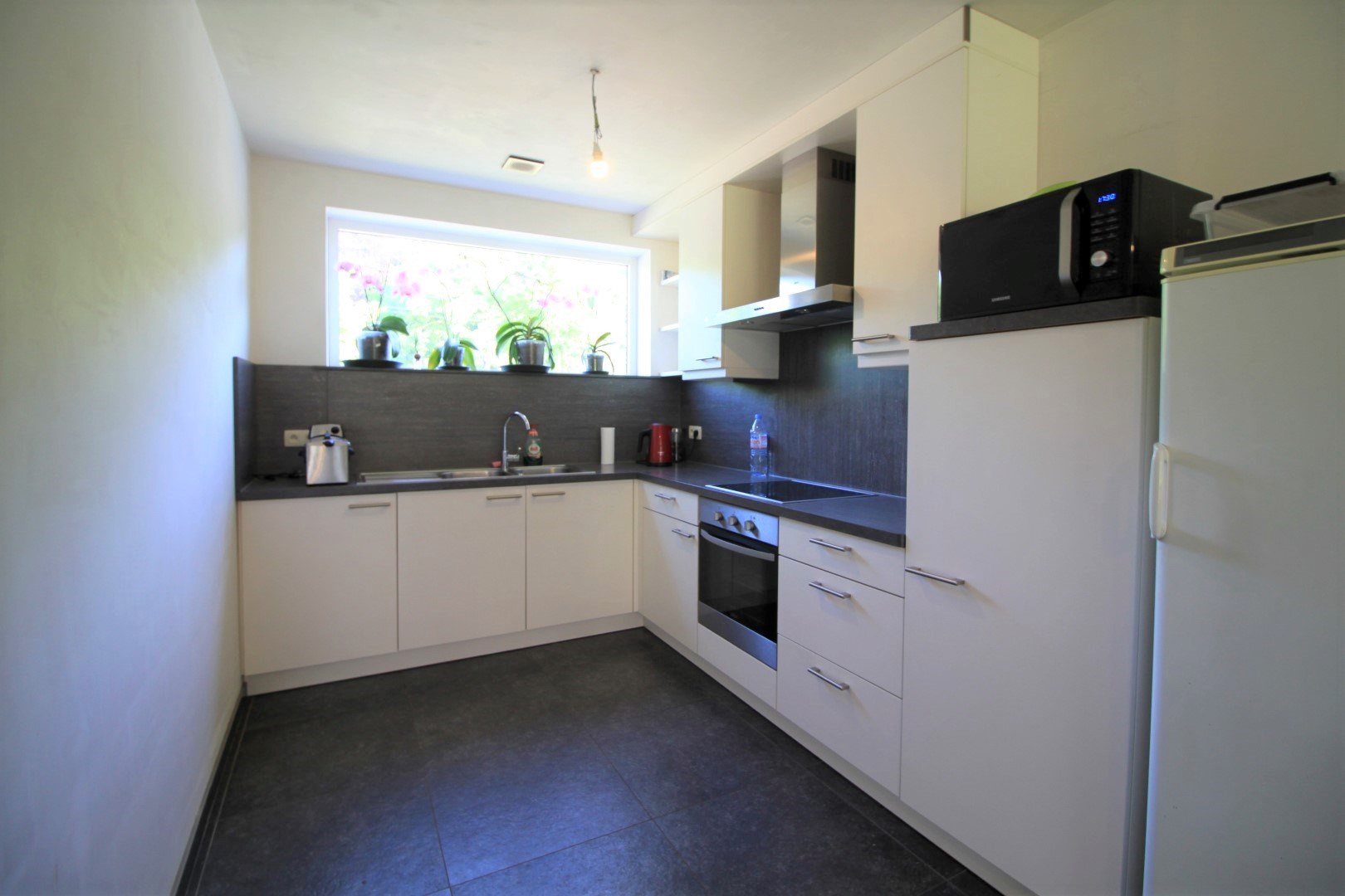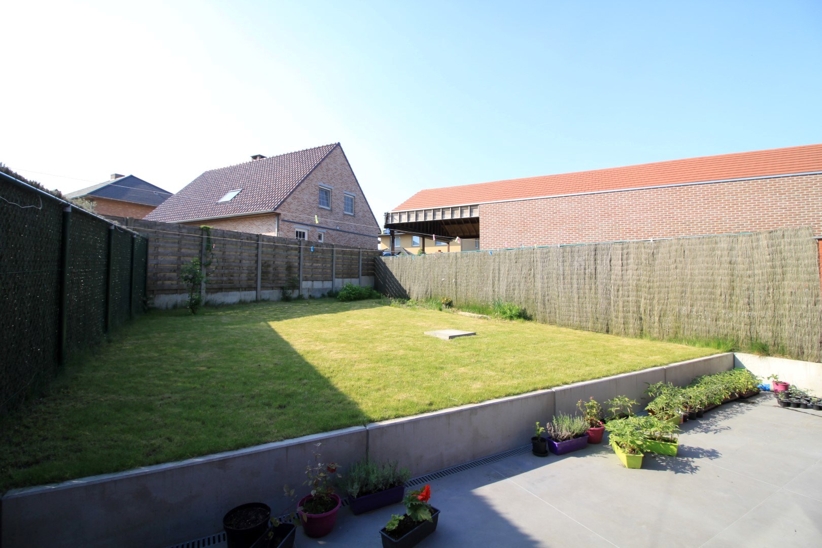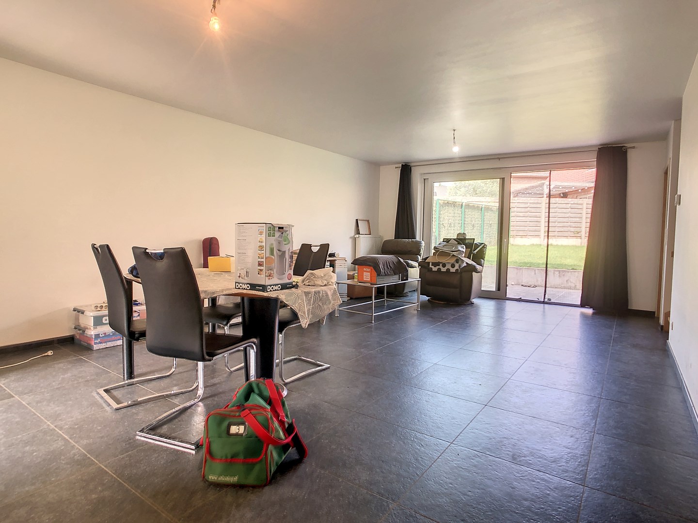 De woning omvat een inkom, toilet, lichtrijke leefruimte met toegang tot het terras en de tuin,