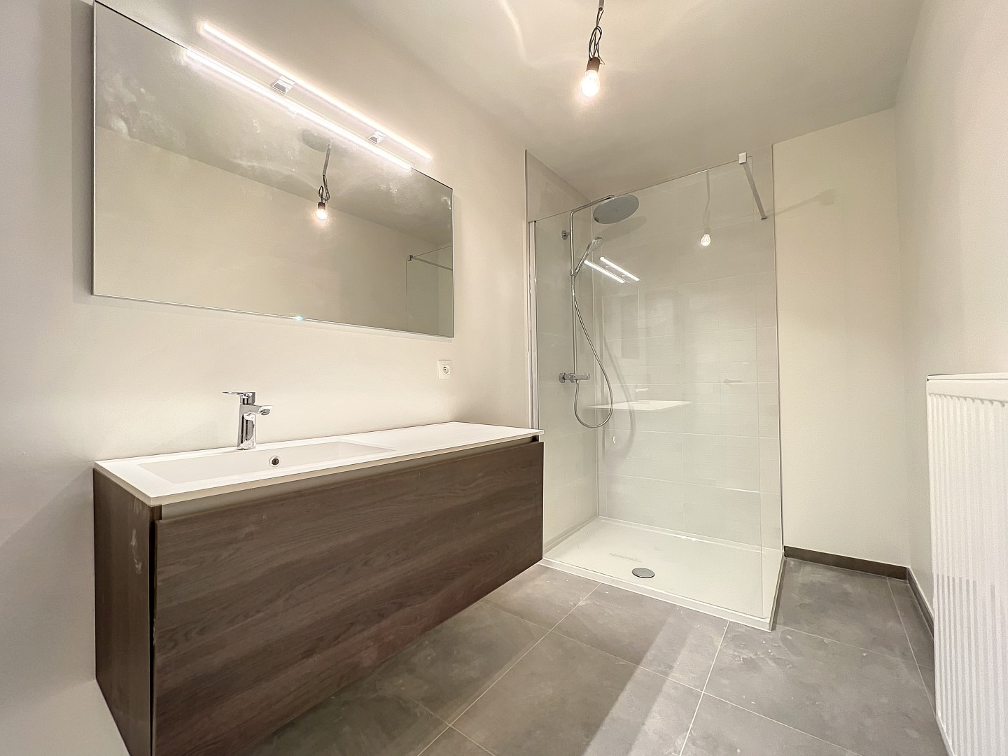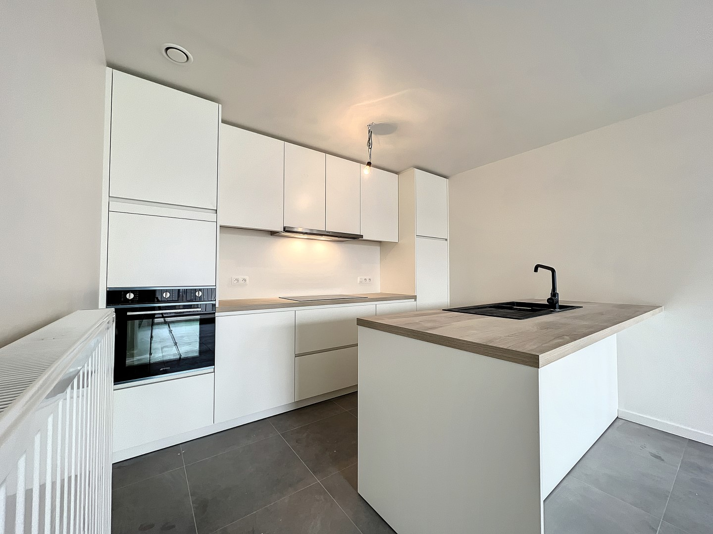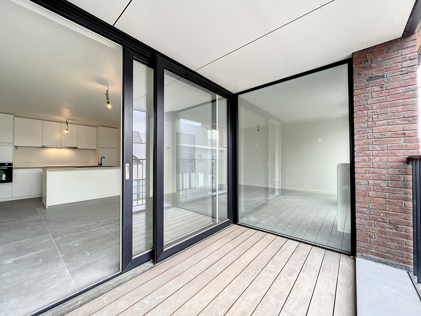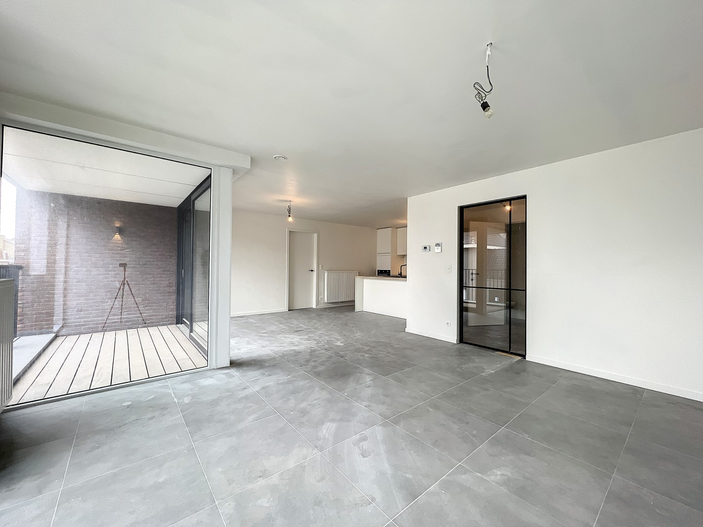 In nieuwbouwresidentie Belle-Vue vindt u dit prachtig appartement dat bestaat uit een inkomhal, toilet, leefruimte met open ingerichte keuken, berging, badkamer (lavabomeubel en douche) en 2 slaapkamers. Het terras bereikt u via een schuifraam in de leefruimte. Mogelijkheid tot aankoop van een garage en/of staanplaats.
