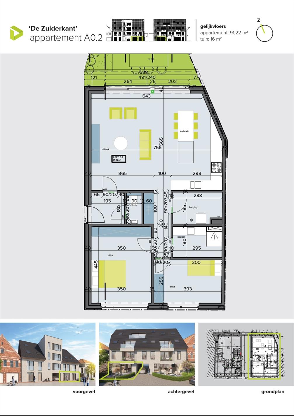Op de gelijkvloerse verdieping van residentie De Zuiderkant bevindt zich dit nieuwbouwappartement bestaat uit inkom, toilet, leefruimte die uitgeeft op de zuidgerichte tuin, open keuken (volledig ingericht), bergruimte, badkamer en 2 slaapkamers (4m45 x 3m50 en 3m93 x 2m55).