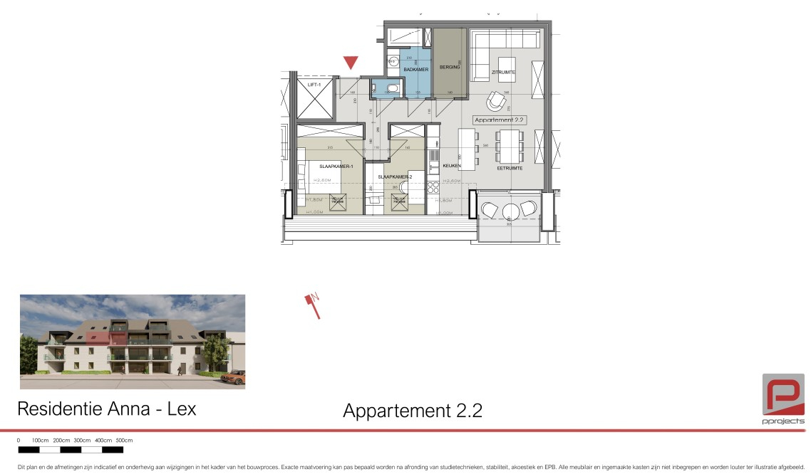 Dit nieuwbouwappartement in Residentie Anna-Lex biedt u een leefruimte met toegang tot het zuidgericht terras, een open ingerichte keuken, bergruimte, toilet, badkamer en 2 slaapkamers.