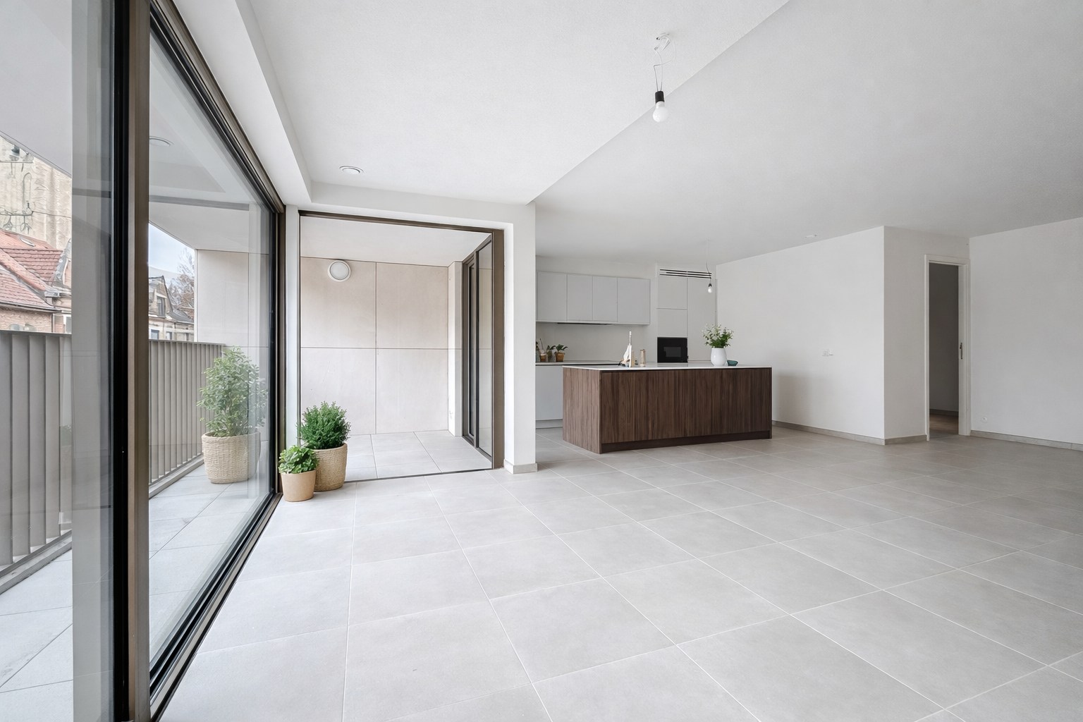 De ruime en heldere leefruimte sluit naadloos aan op de open keuken, uitgerust met moderne toestellen. Dankzij de vloerverwarming, aangesloten op het duurzame warmtenet, heerst er doorheen het hele appartement een aangename warmte.