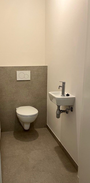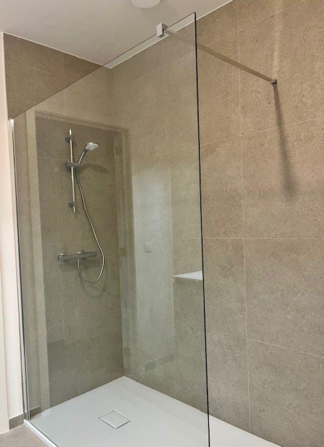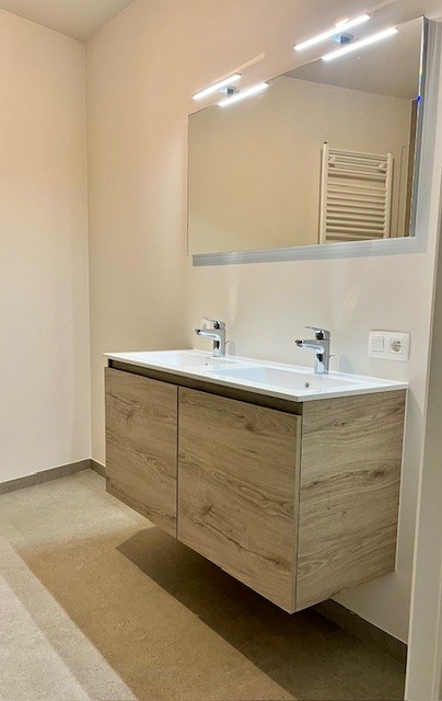 De badkamer wordt voorzien van een inloopdouche en een lavabomeubel.