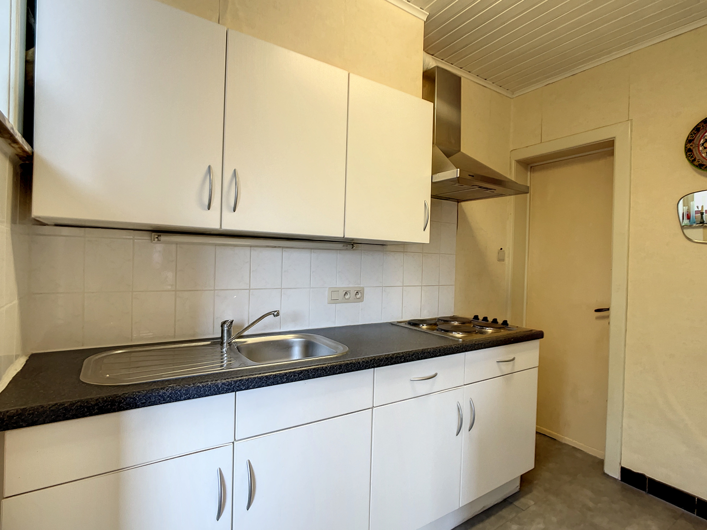 Deze half-open woning beschikt over een inkom, zonnige leefruimte, gesloten keuken, berging, badkamer met lavabomeubel en douche, toilet, 2 grote slaapkamers en 1 kinderkamer. De zolder is bereikbaar via vaste trap.