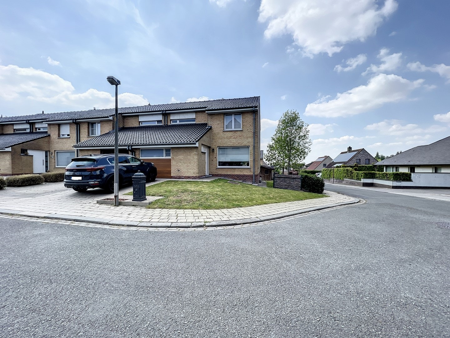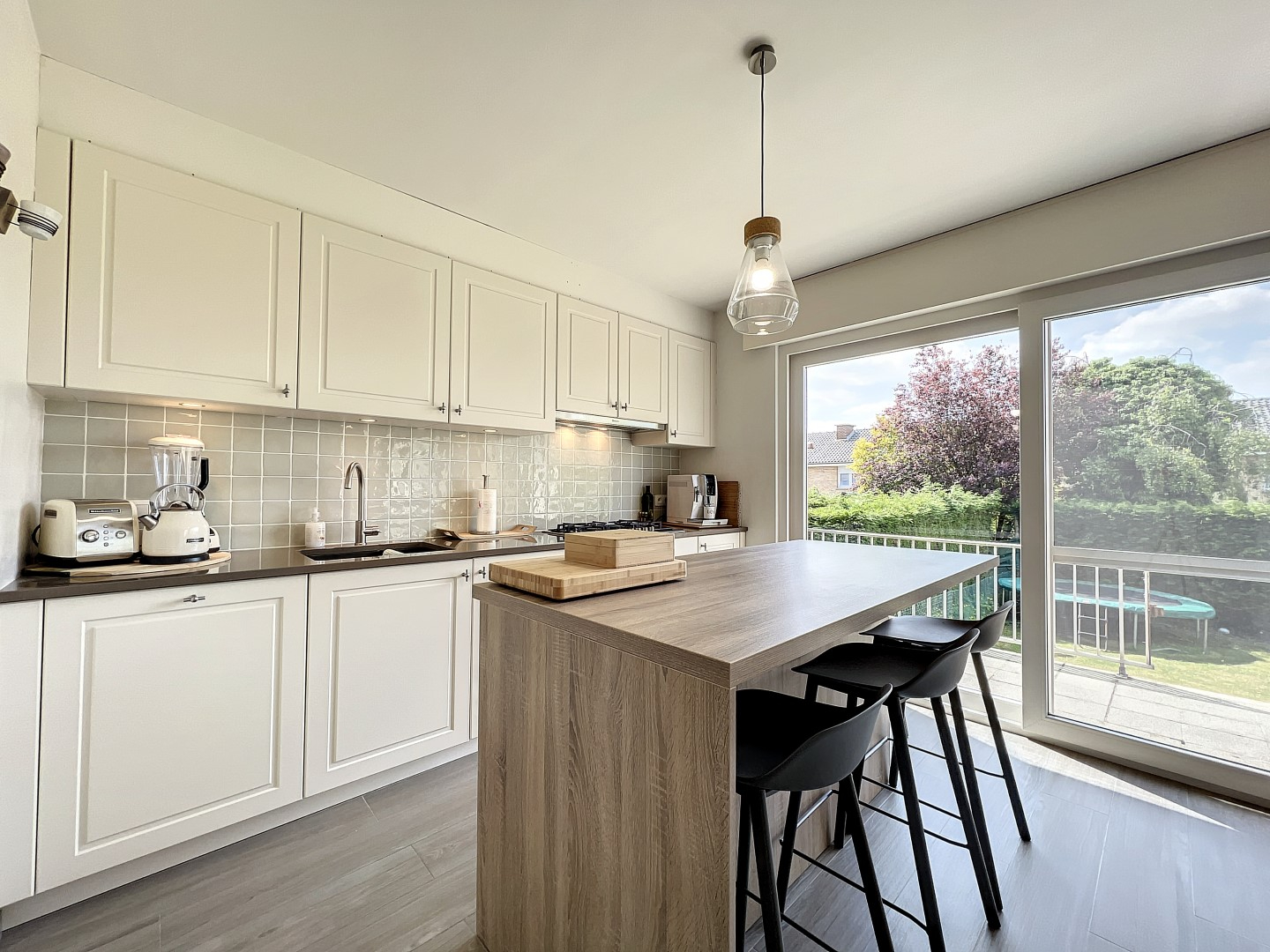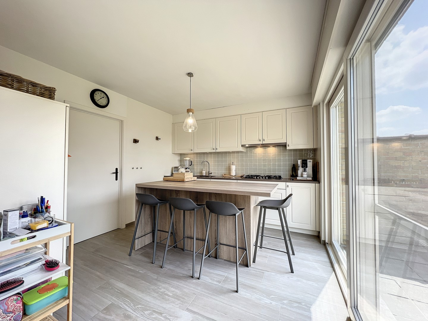 inkomhal met apart toilet, lichtrijke leefruimte (voorzien van een pelletkachel), volledig ingerichte keuken met eiland, ruime berging met wasplaats én bureau-ruimte. Op het verdiep bevinden zich 3 volwaardige slaapkamers, berging en badkamer (bad met douchemogelijkheid, lavabo en toilet).