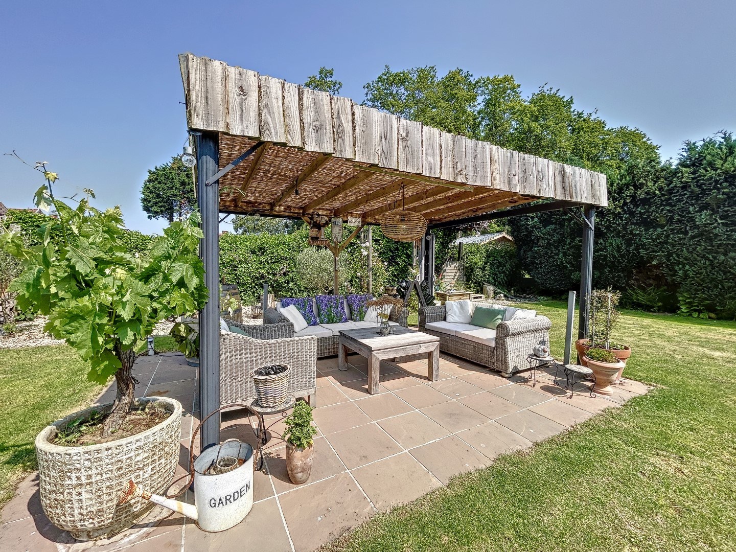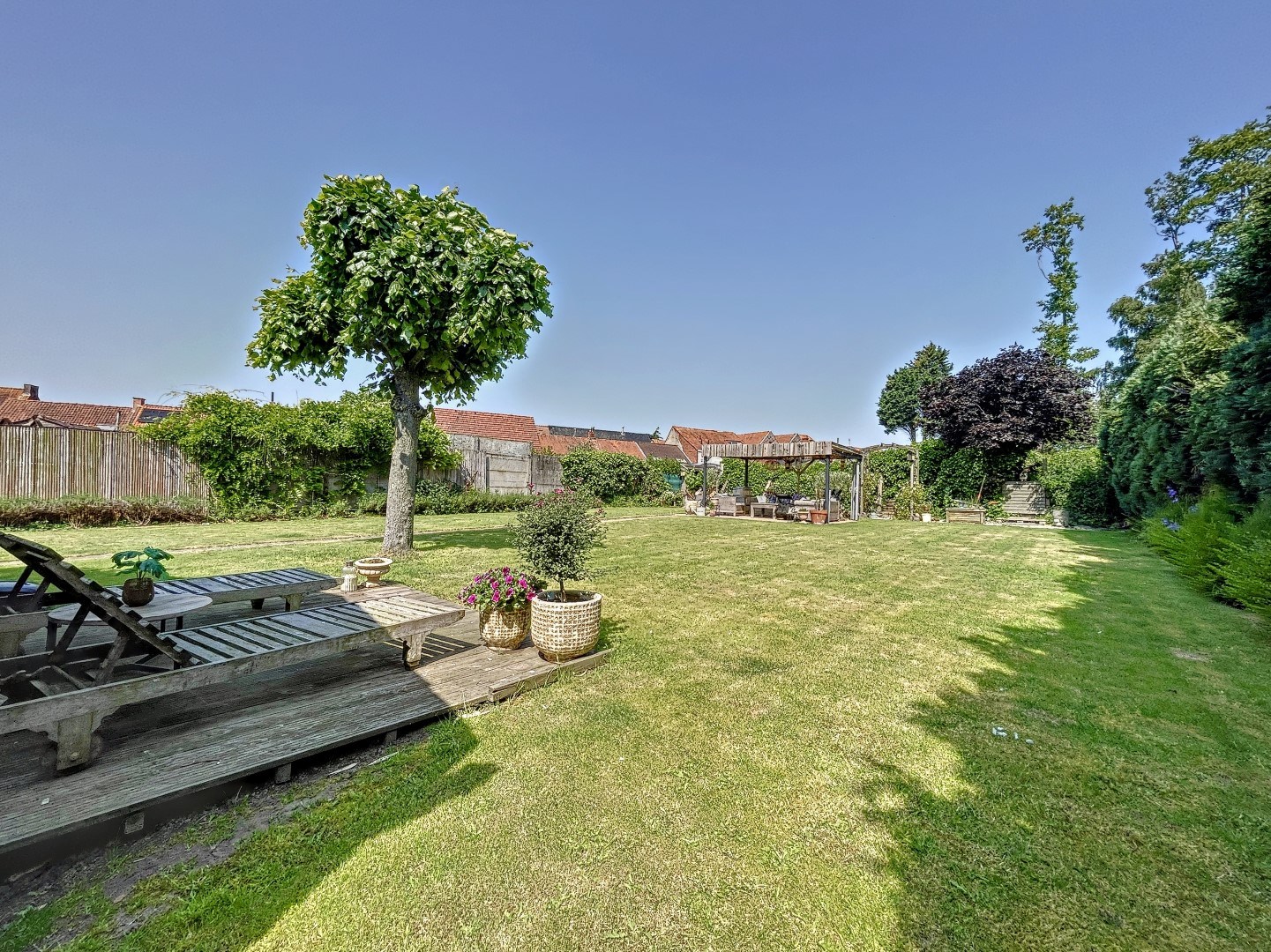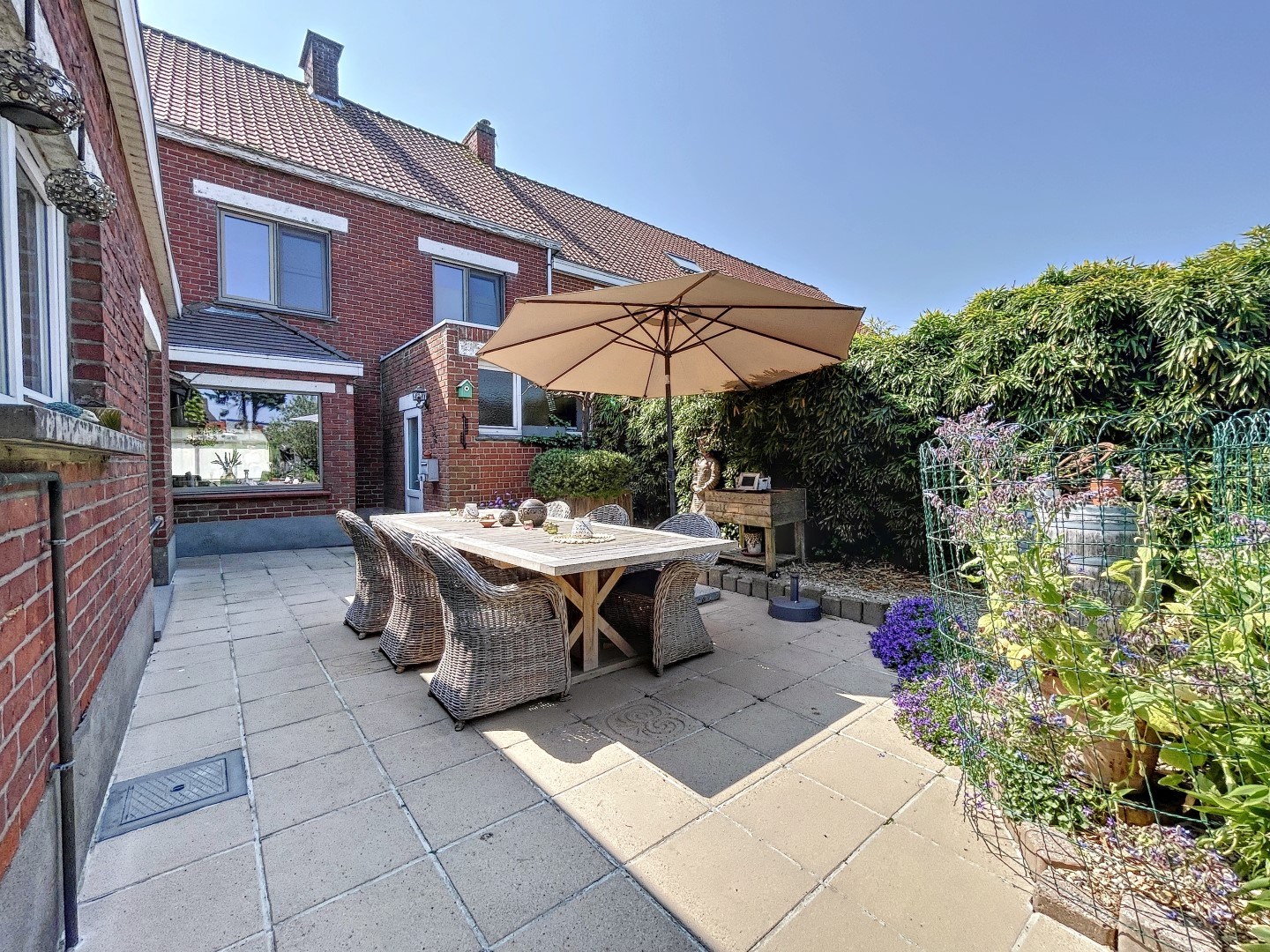 Eens u buiten bent, geniet u meteen van een oase van rust! U kan genieten op het groot zonneterras met aansluitend de zeer ruime maar onderhoudsvriendelijke tuin, een bar en een extra aangelegd overdekt terras en verschillende tuinbergingen. Tevens beschikt u aan de voorzijde van de woning over een grote privé-parking, die u ook meteen toegang biedt tot de tuin.