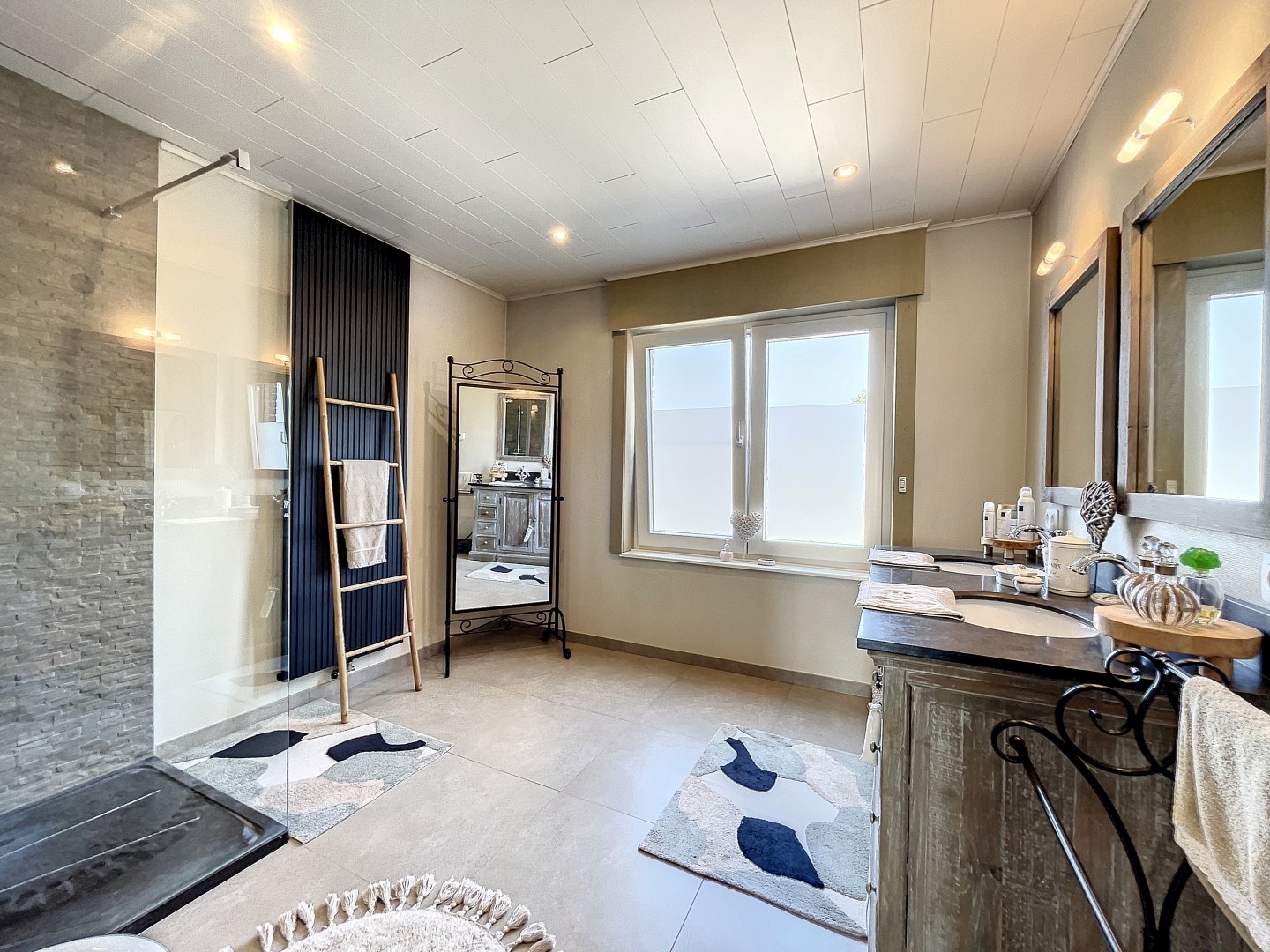 Hier bevinden zich 3 ruime slaapkamers (allen 2-persoons), de eerste badkamer is voorzien van een bad en lavabo & de tweede badkamer werd voorzien van inloopdouche, dubbele lavabo met meubel en toilet (volledig vernieuwd!).