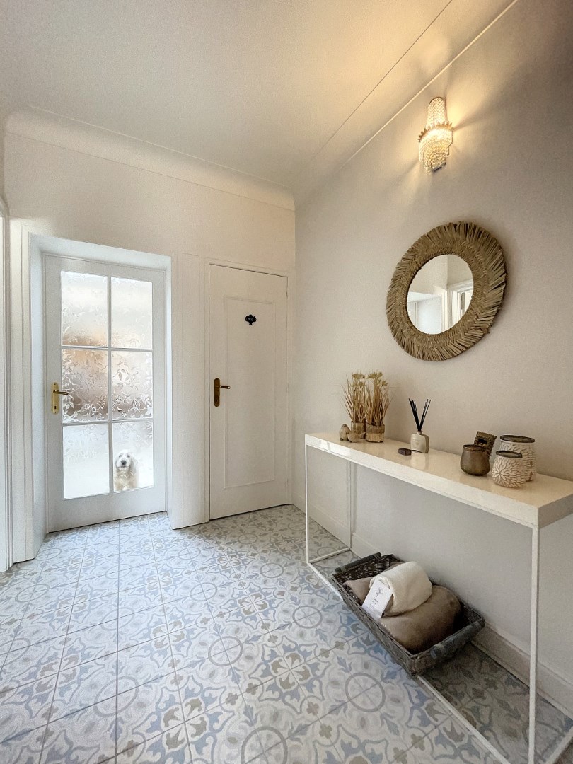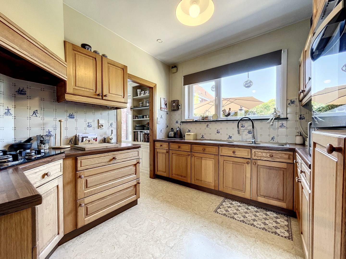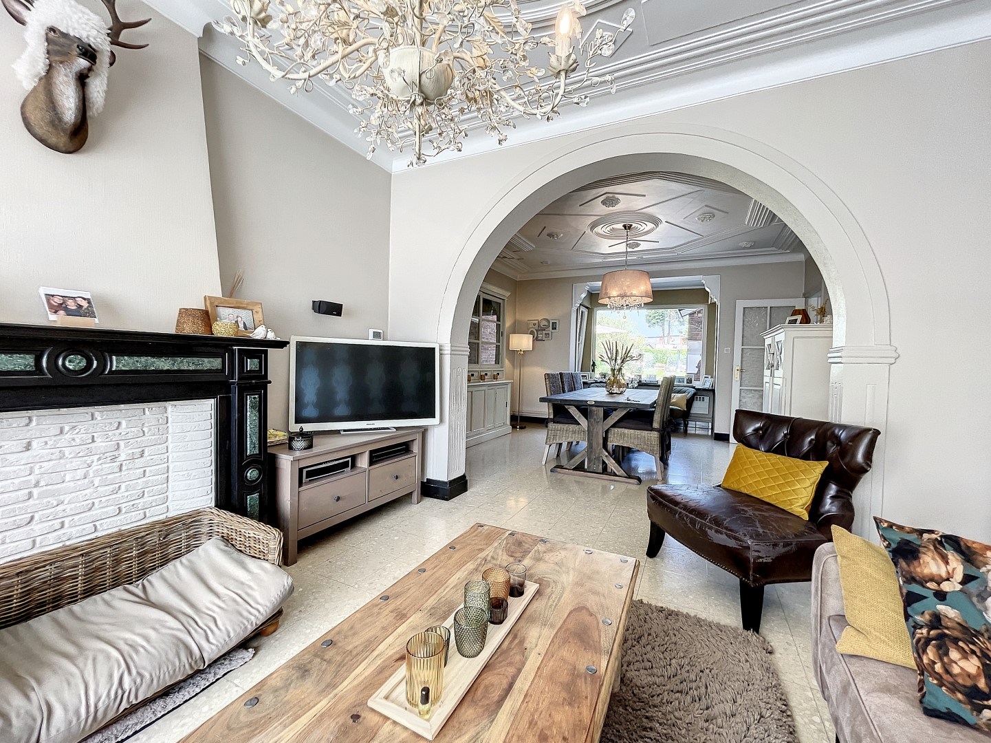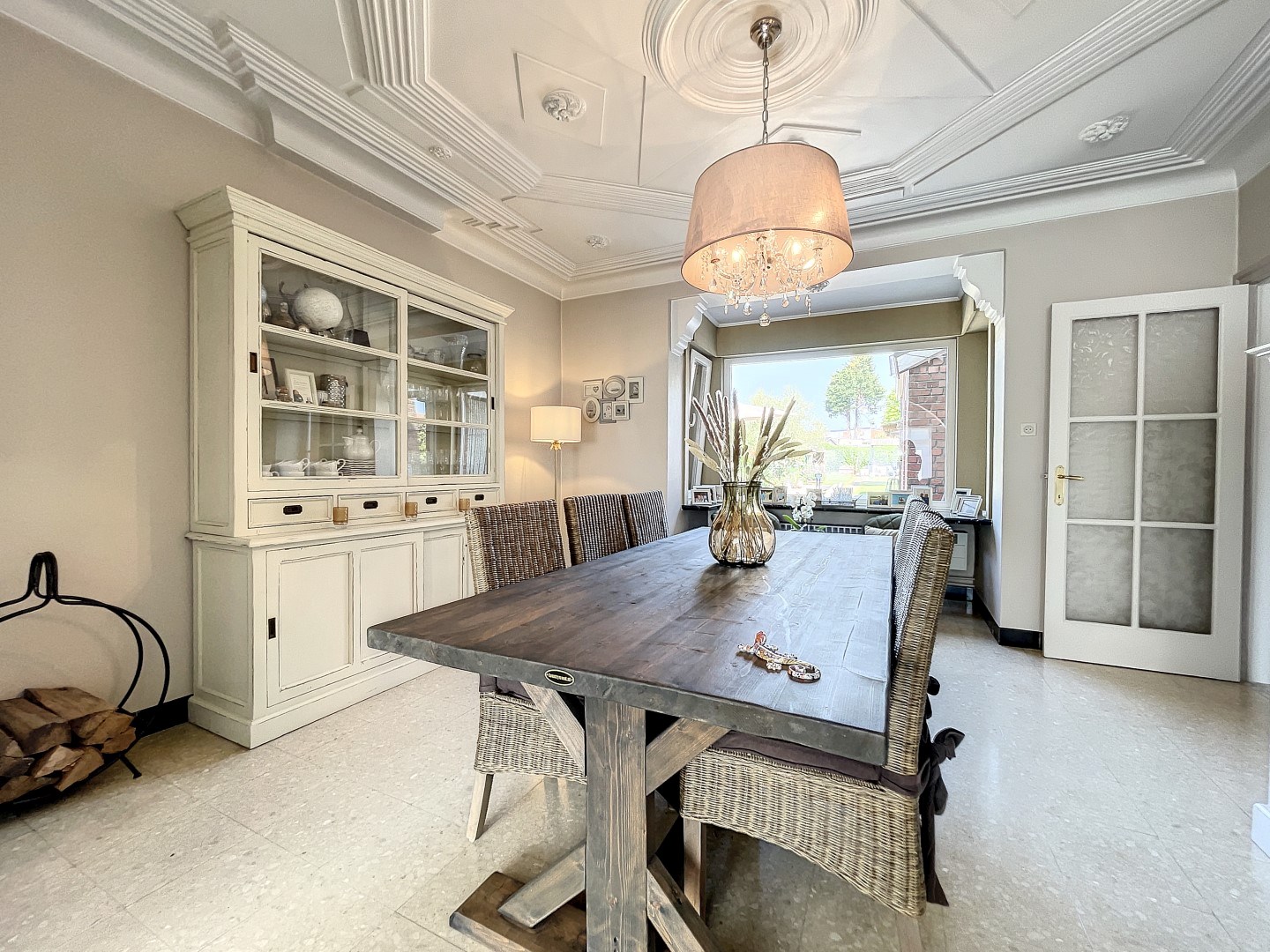 Bij het betreden van de inkomhal voel je meteen de sfeer van de woning; een gezandstraalde trap passend bij het vernieuwde patroon-vloertje, én de moulures aan het plafond. Daarachter bevindt zich de ruime leefruimte waarbij u zicht hebt op het terras en de prachtig aangelegde tuin. Er is een volledig ingerichte keuken met aansluitend een eetkamer. Tevens beschikt u over een gastentoilet, berging, kelder en dubbele garage voorzien van een elektrische sectionaalpoort (alsook aansluiting voor uw wasmachine).