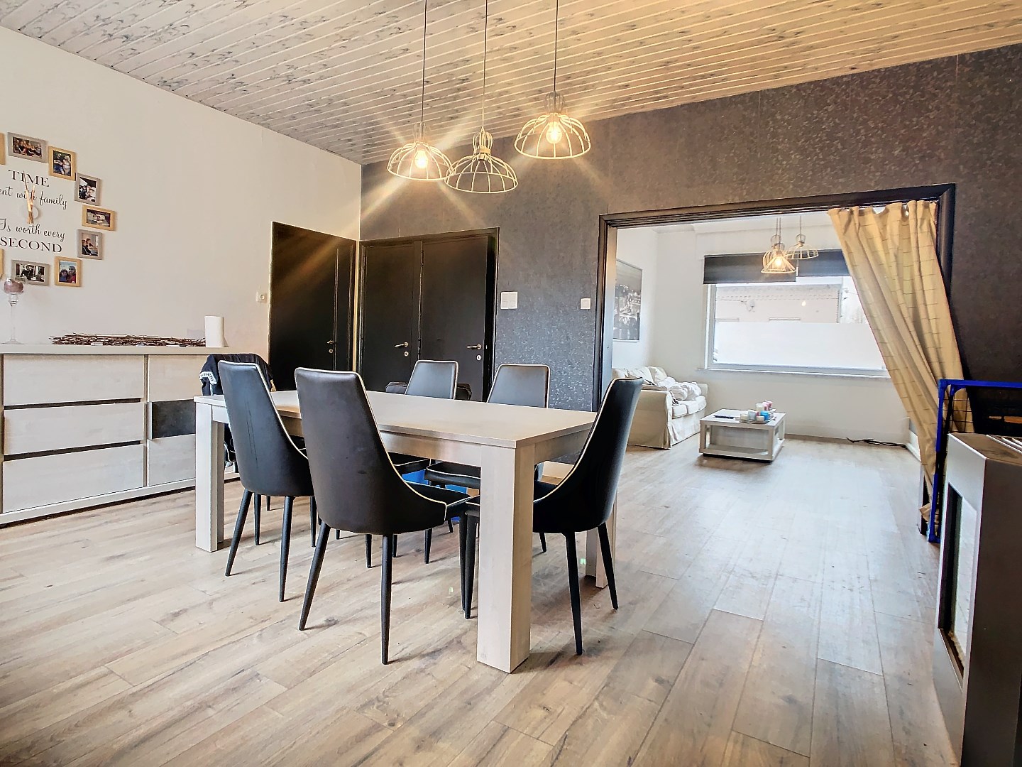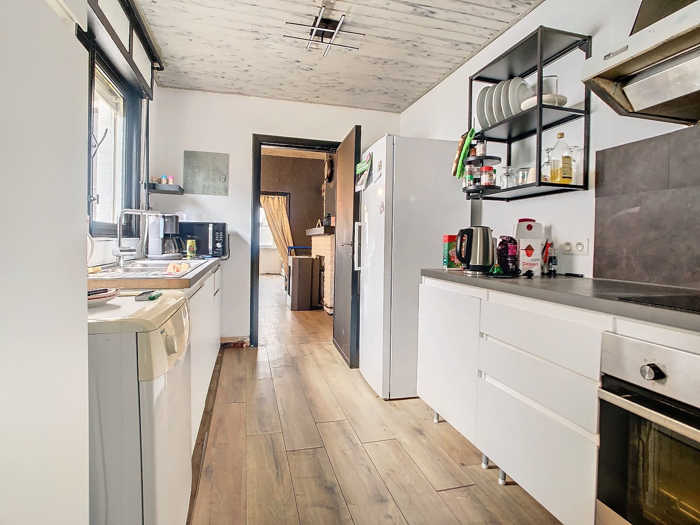 Via de inkom, komen we in de leefruimte (zithoek en eethoek) met daarachter de keuken en badkamer. Er is ook een kelder en een grote bergruimte (ook toegankelijk via aparte inkom).