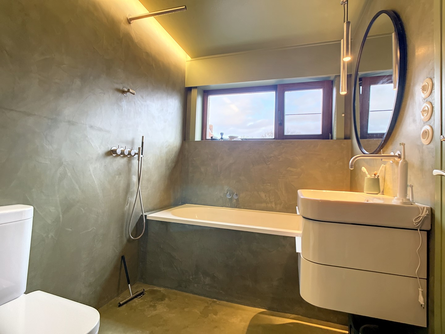 * badkamer met lavabomeubel, douche, ligbad en toilet