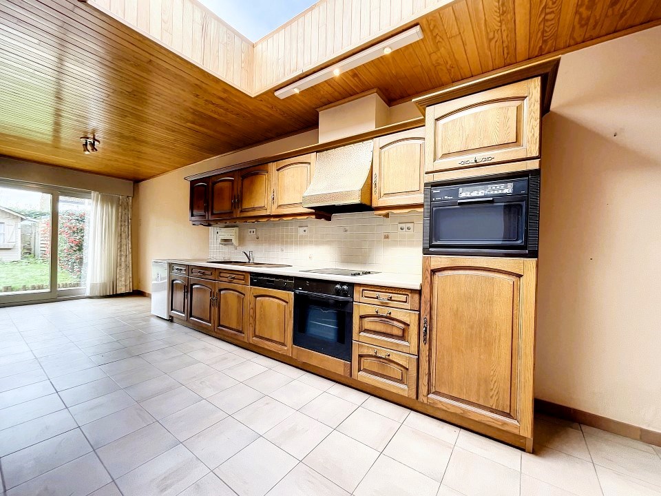 De keuken is voorzien van een groot schuifraam, dat direct toegang biedt tot de zuidgerichte tuin met tuinhuis.