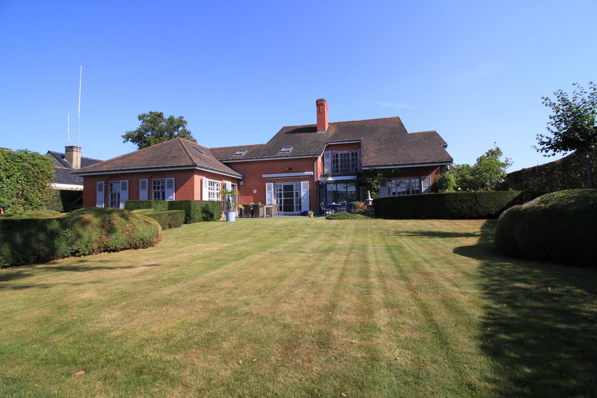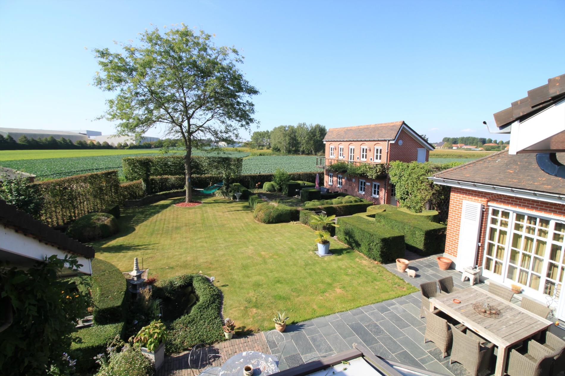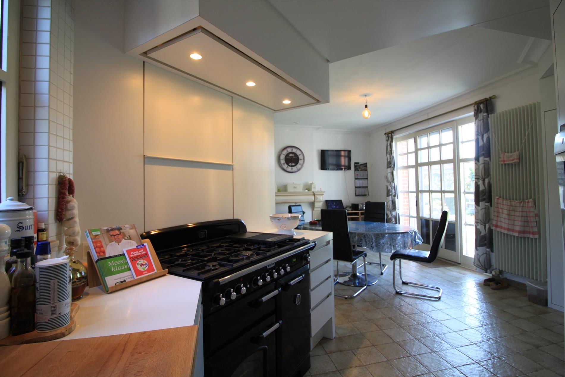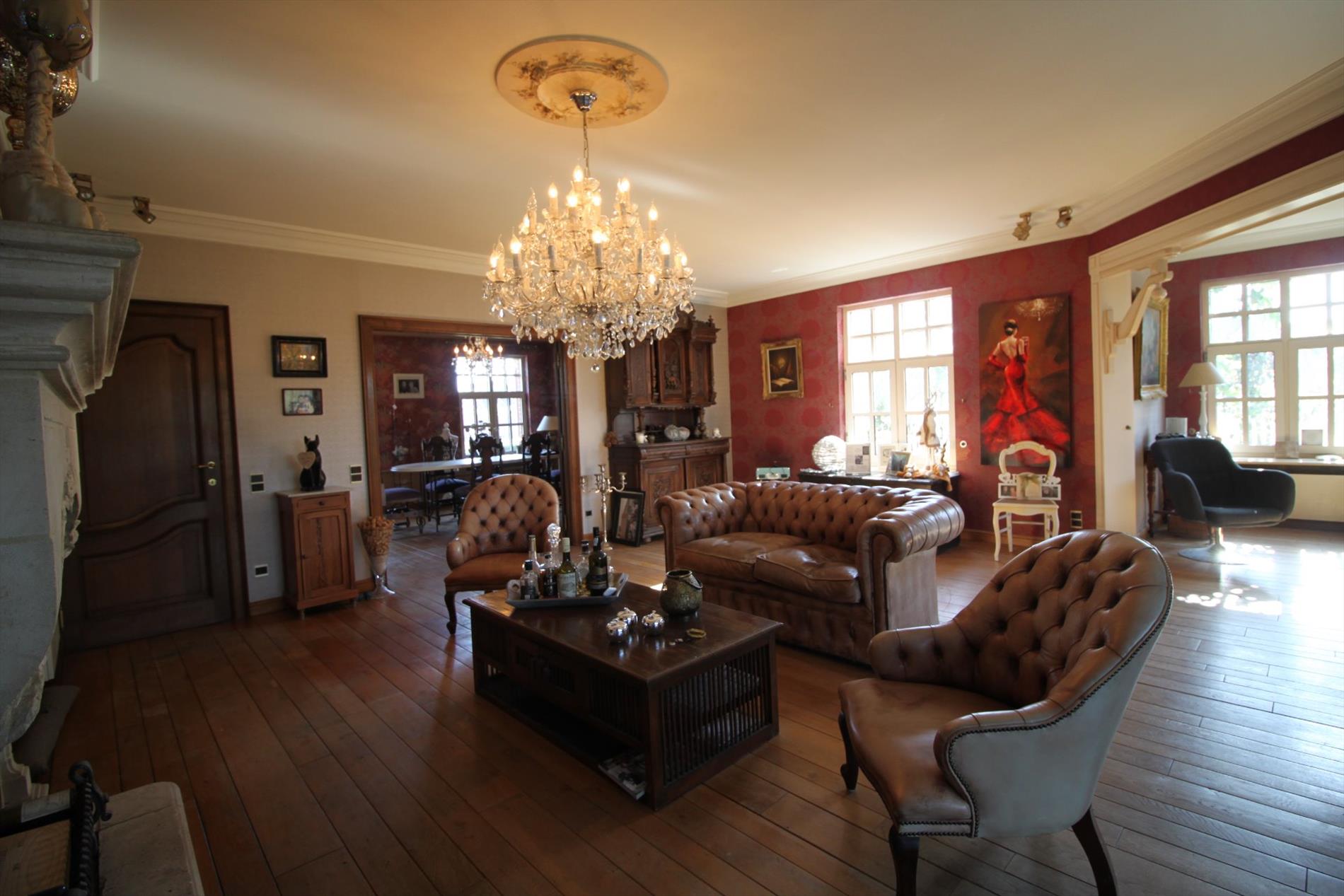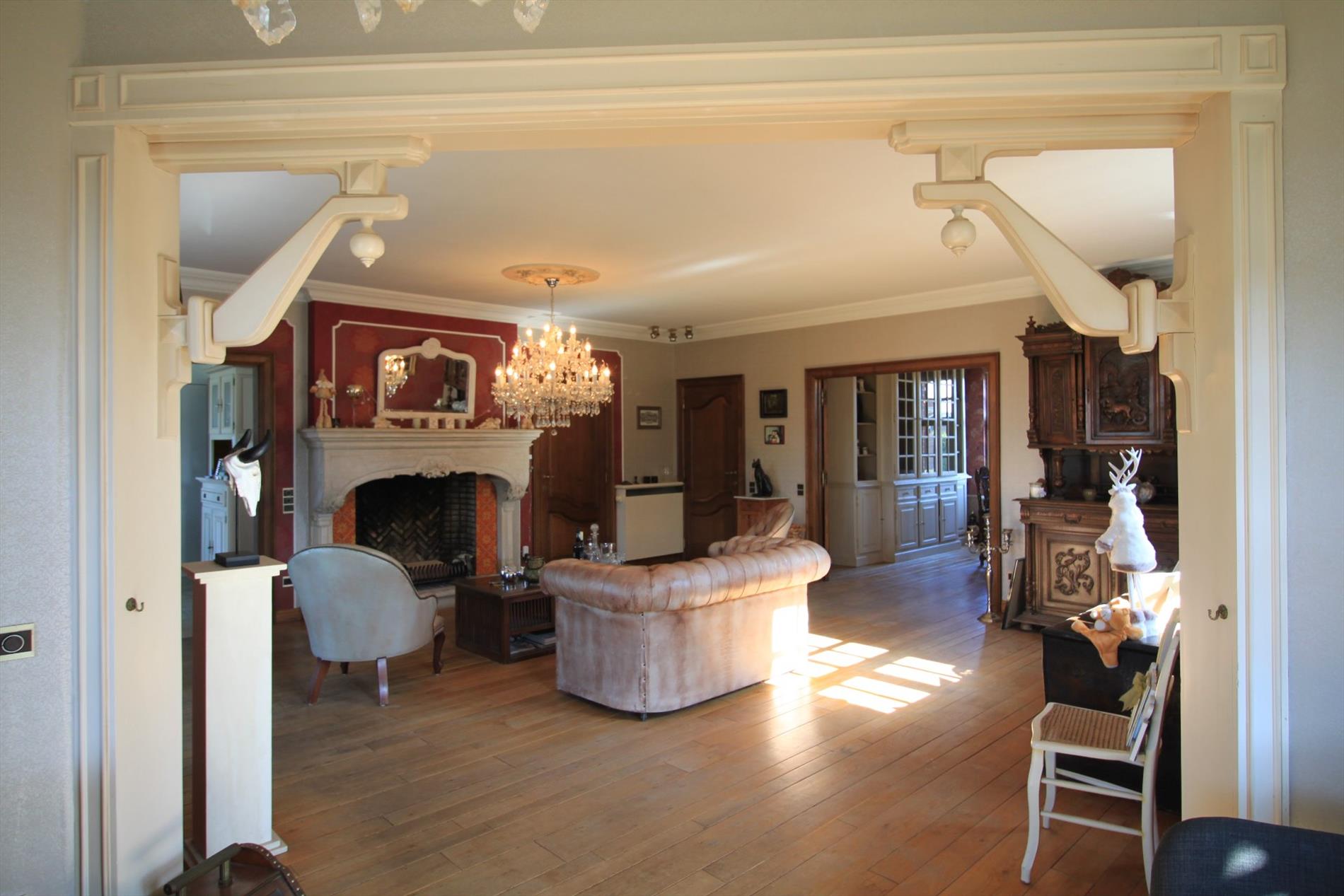 Via de karakteristieke inkomhal betreedt u de lichtrijke en imposante leefruimte met zijn prachtige houten vloeren. Bij de prachtige open haard is het gezellig vertoeven in de zitruimte. Tevens omvat deze sfeervolle leefruimte nog een afzonderlijke TV-hoek en eetkamer. De hedendaagse keuken is volledig ingericht en geeft u rechtstreeks toegang tot het terras en de prachtige tuin. De grote garage biedt u ruimte voor het plaatsen van 2 wagens. Op het gelijkvloers bevindt zich nog een grote polyvalente ruimte én een bureau. Aan bergruimte is er ook geen gebrek.