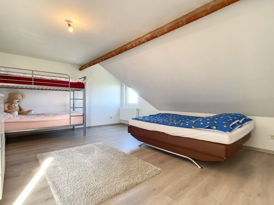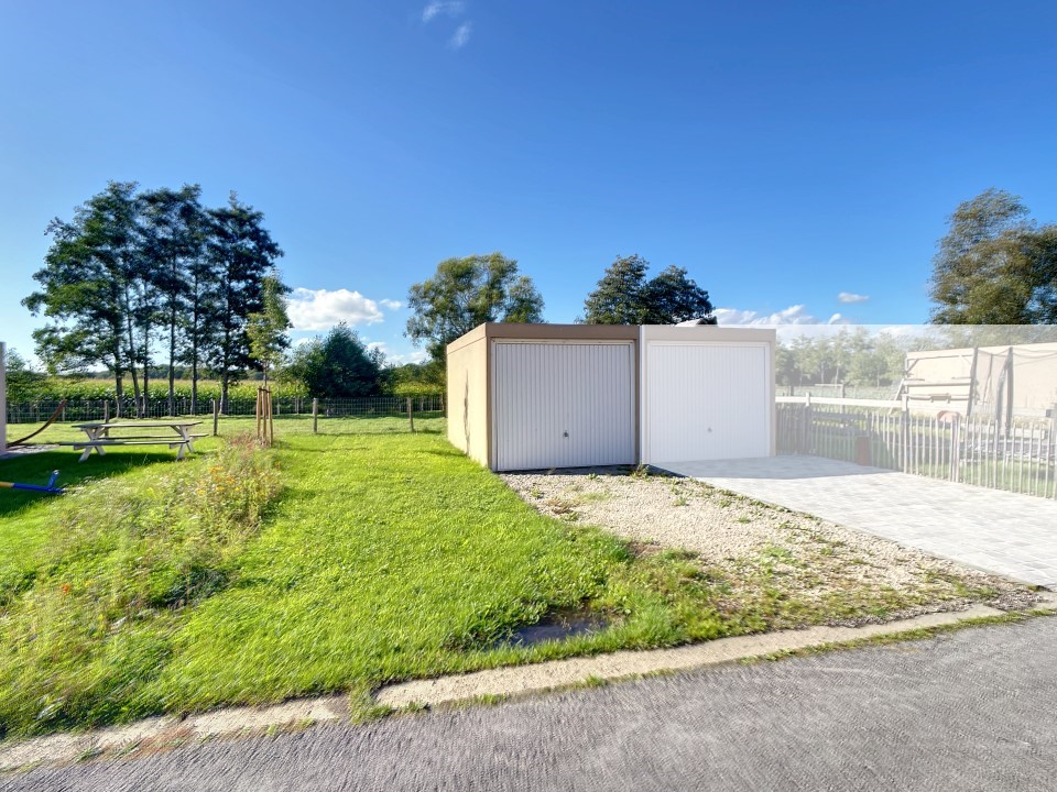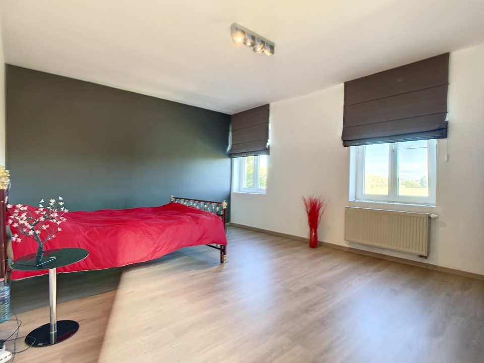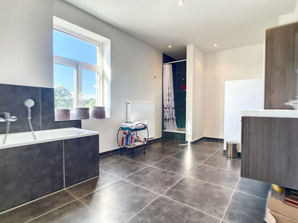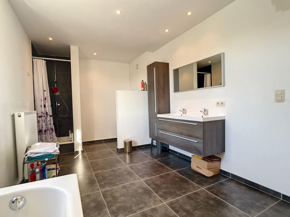 Op de verdiepingen voorziet de woning nog 3 grote slaapkamers en een ruime badkamer met ligbad, douche, dubbele lavabo en 2de toilet. Achter de woning ligt de private garage.