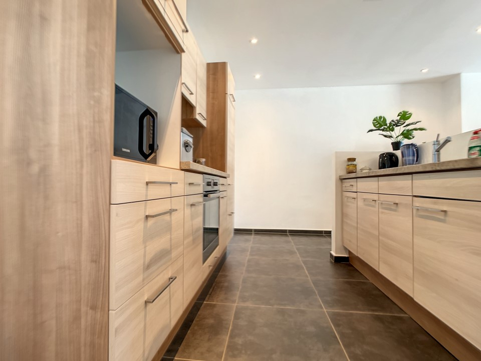 Deze volledig gerenoveerde woning is heel rustig gelegen en beschikt op het gelijkvloers over een inkom, gastentoilet, bureau, bergruimte, leefruimte met veel lichtinval die uitgeeft op het terras en de tuin én een open ingerichte keuken.