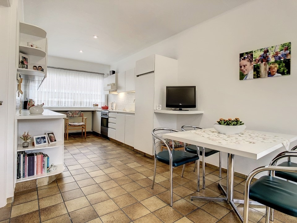 * ingerichte leefkeuken (dubbele gootsteen/oven/gasfornuis/koelkast met vriesvak) met schuifraam dat uitgeeft op het terras