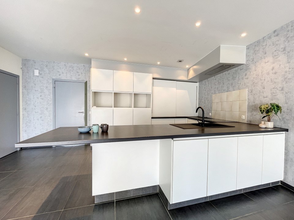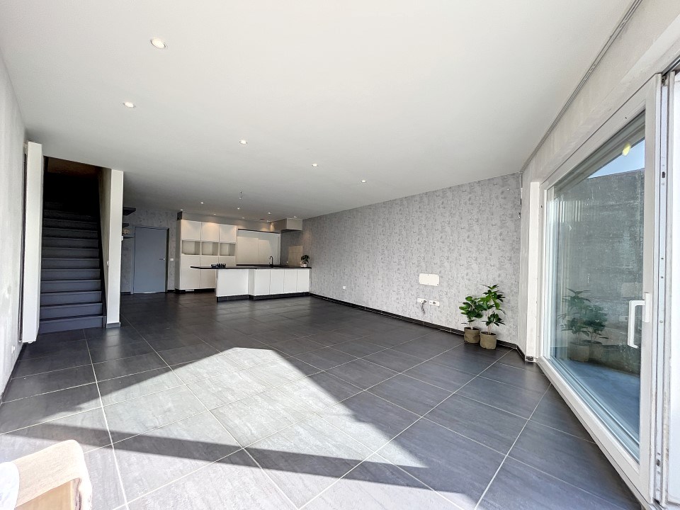 Via de ruime inkomhal, met een extra kamer (mogelijkheid tot maken van slaapkamer, bureau, speelkamer, ...), bergruimte en toilet, komen we in de lichtrijke leefruimte met open ingerichte keuken. Vanuit de leefruimte heb je, via het schuifraam, toegang tot de zuidgerichte tuin met terras.