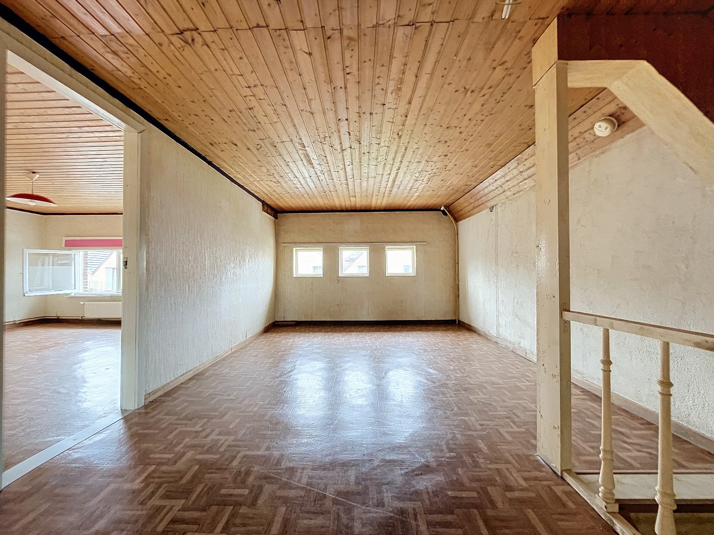Op het verdiep vindt u een grote overloop, 2 heel ruime slaapkamers (kan makkelijk tot meerdere kamers omgebouwd worden) en de badkamer.