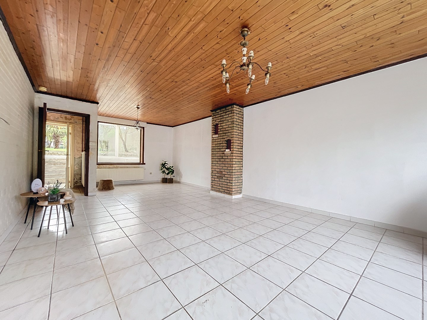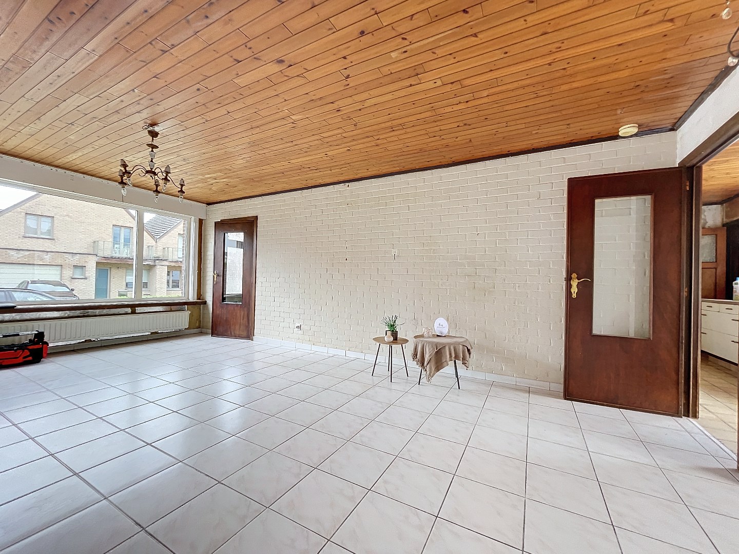 Er is een grote, lichtrijke leefruimte met aangrenzende ruimte voor keuken en vervolgens een lichtrijke veranda.