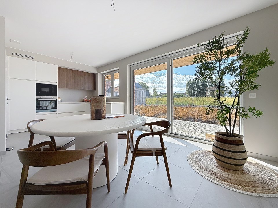 Bij het betreden van de woning komen we binnen via een ruime inkomhal met gastentoilet. Aansluitend bevindt zich de lichtrijke leefruimte met grote raampartijen, die naadloos overgaat in de open, volledig uitgeruste keuken met moderne toestellen – ideaal voor gezellige kookmomenten!